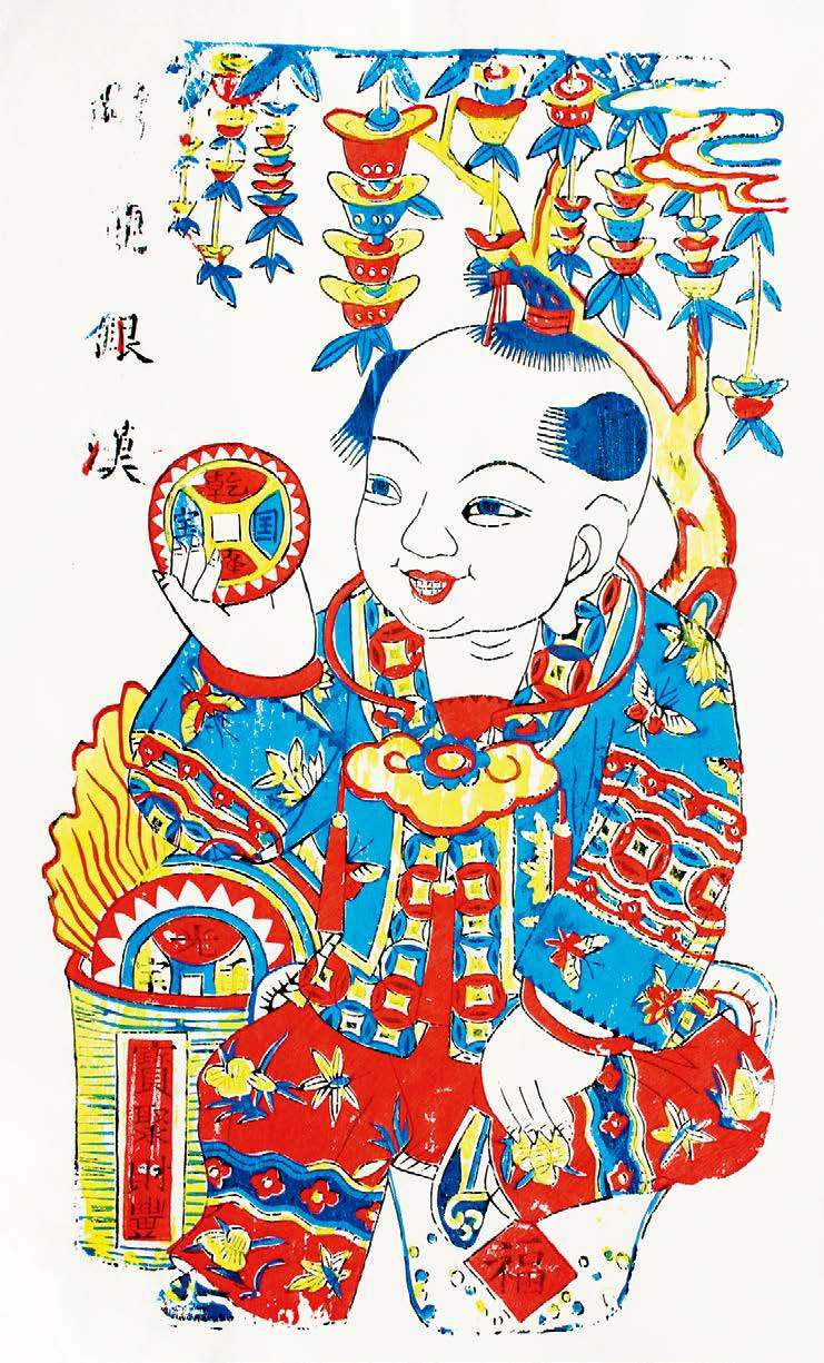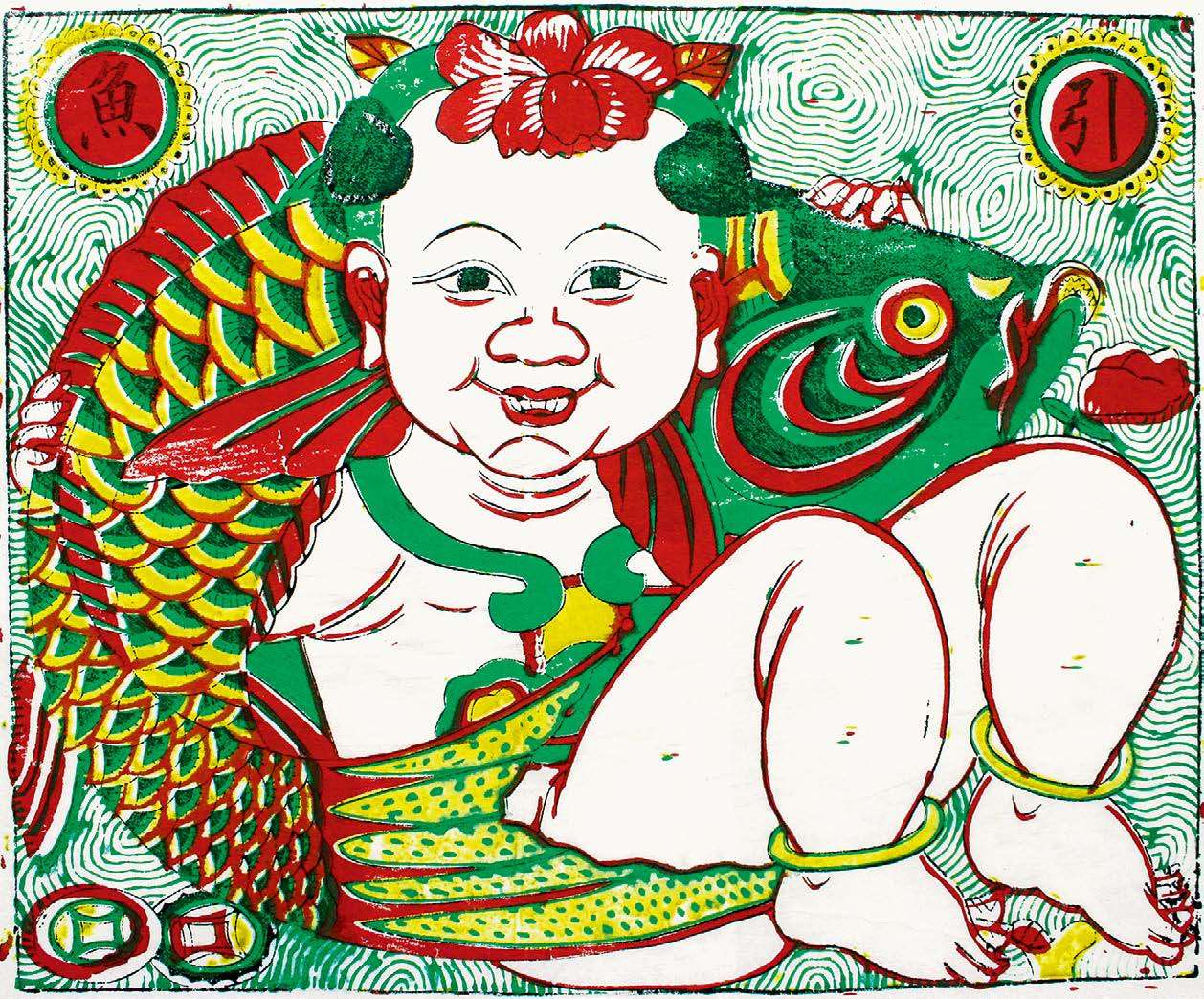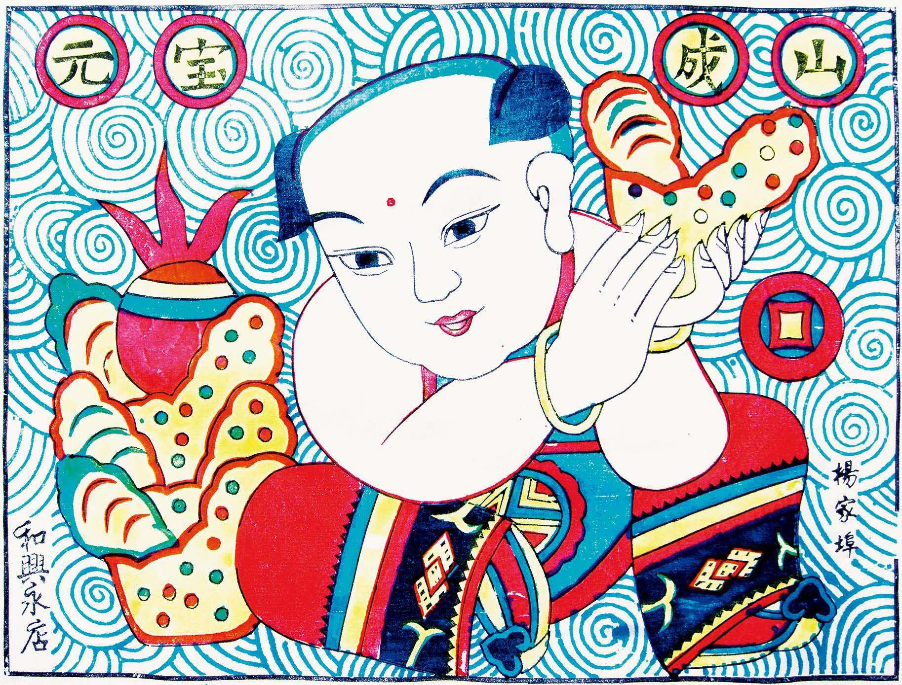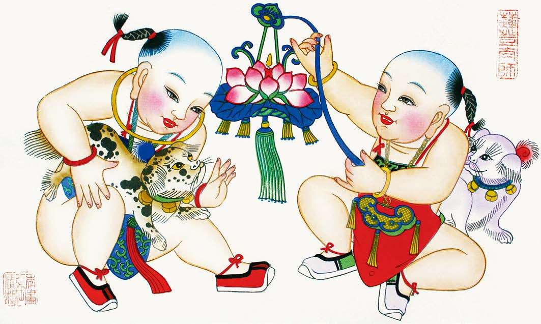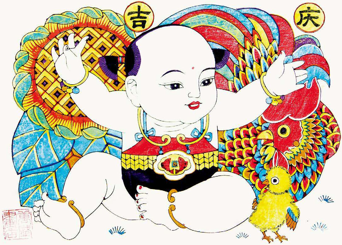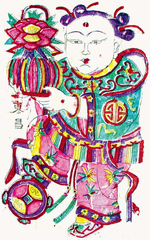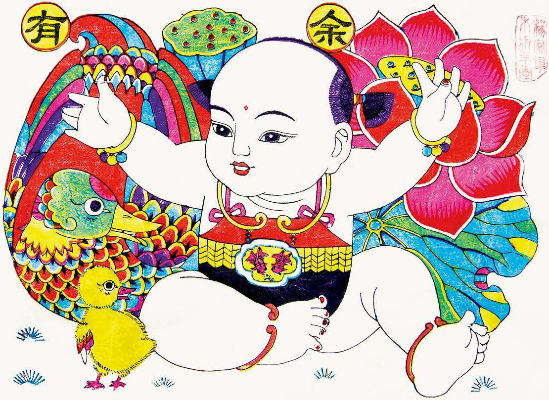 娃娃图案最集中出现在民间年画中,它色彩绚丽、构图喜庆、寓意祥和、传承千年,成为中国传统文化的象征性图案和标志性符号。
