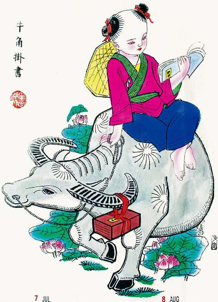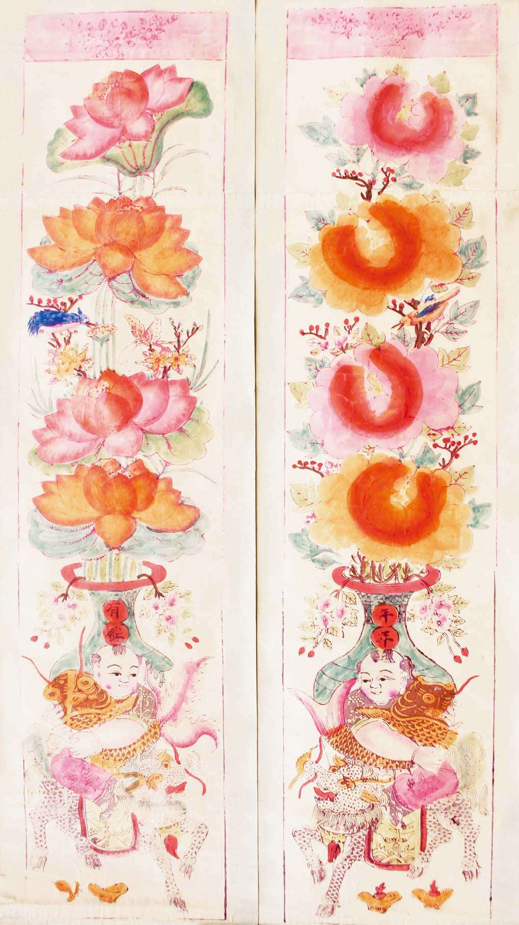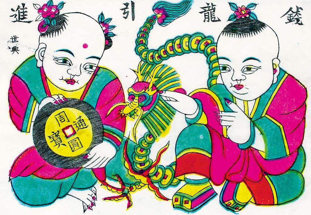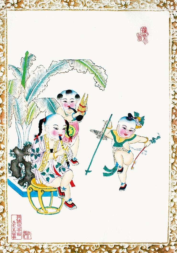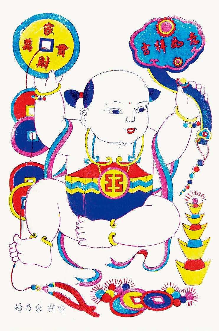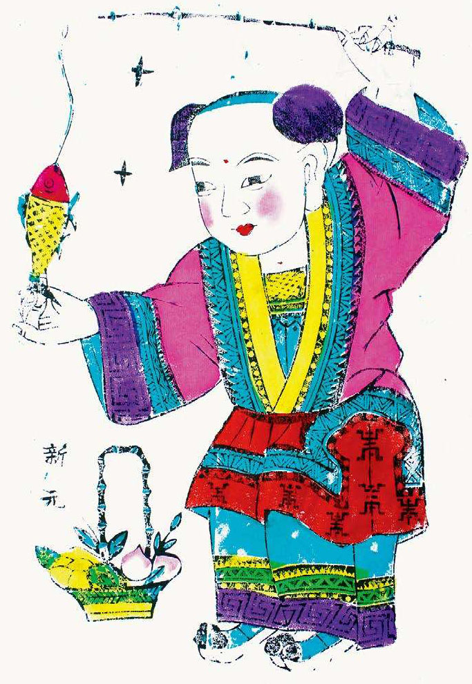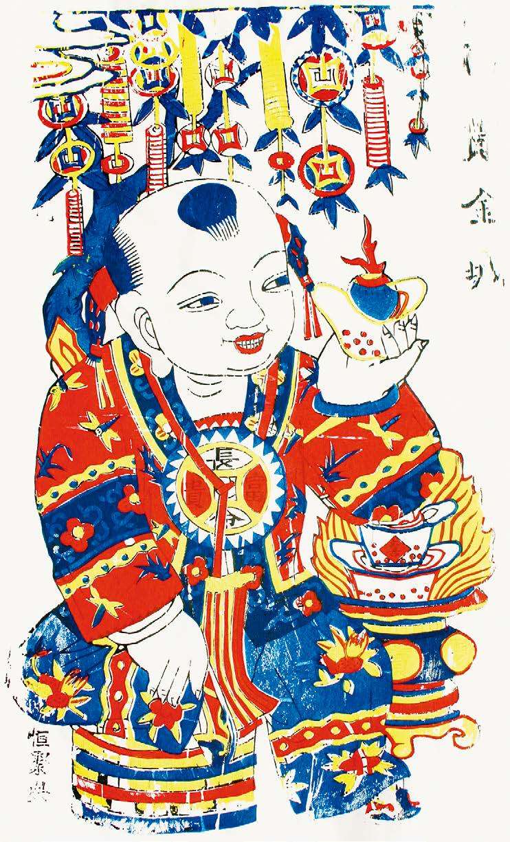 娃娃图案最集中出现在民间年画中,它色彩绚丽、构图喜庆、寓意祥和、传承千年,成为中国传统文化的象征性图案和标志性符号。