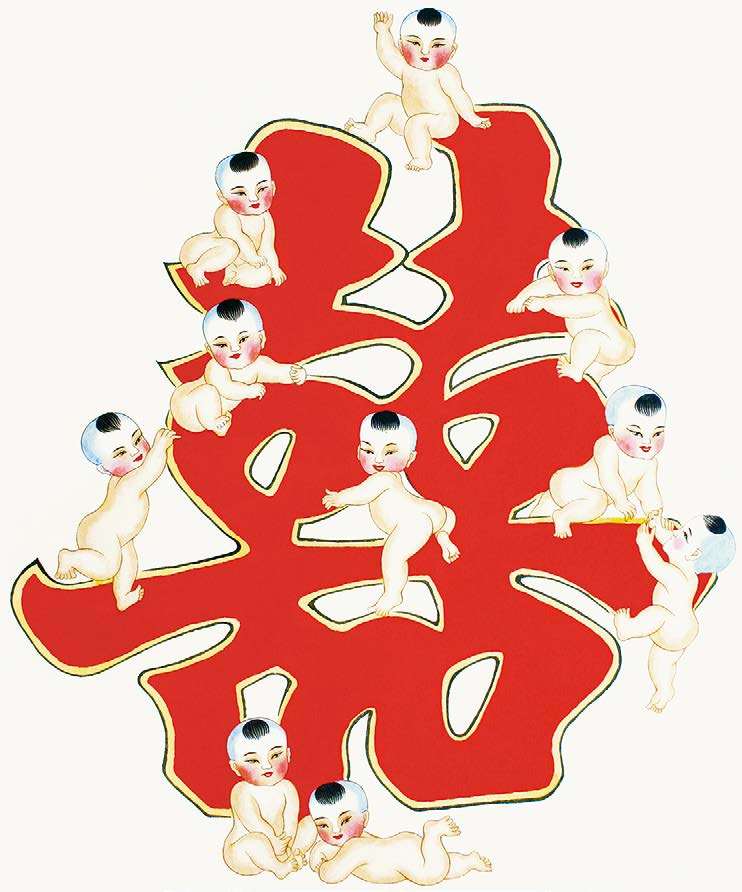 有些娃娃图与文字搭配,在吉祥文字“福”“禄”“寿”“喜”等字上,画一个娃娃。用文字表达人们美好心愿的手法,早在汉锦上便运用得极为广泛,到了明清时期则得到了空前的发展。