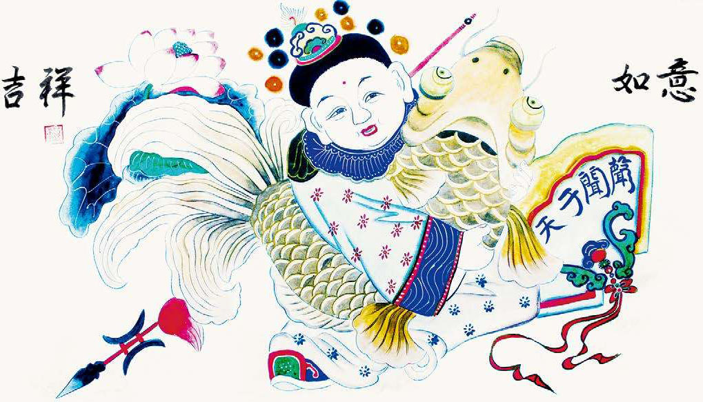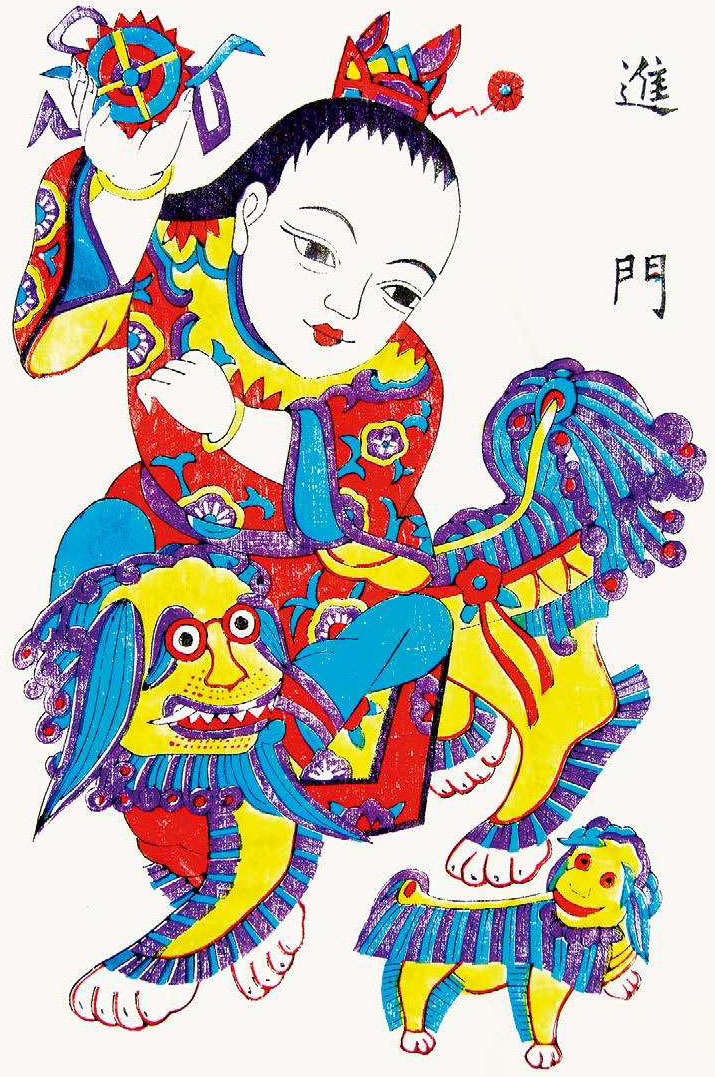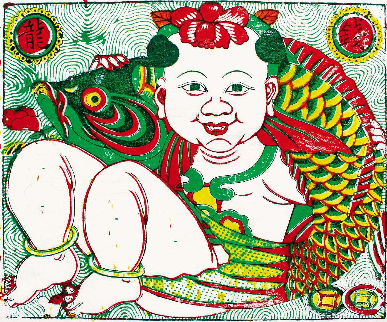 年画中的娃娃代表着新生,诠释着最鲜活的生命。捧着花瓶的娃娃、骑着红鲤鱼的娃娃、踩着莲花的娃娃等,都是吉祥喜庆的化身、幸福生活的天使。人人都向往的东西,自然成了民间艺人表现的主题,年画艺人画得越来越多,娃娃图案传播得越来越广,娃娃年画图也越来越深入人心。