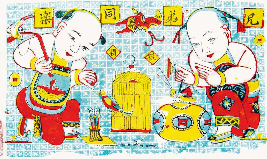 小时候兄弟同乐,长大了争功名利禄,光宗耀祖。一幅赏心悦目的年画,曲折表达了深刻的含义。