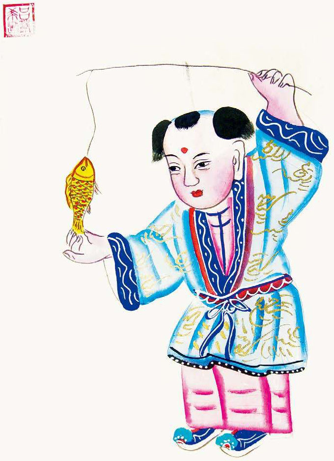 鱼者,余也,表富裕。手绘年画《钓鱼童子》,表现了年年有余的主题。