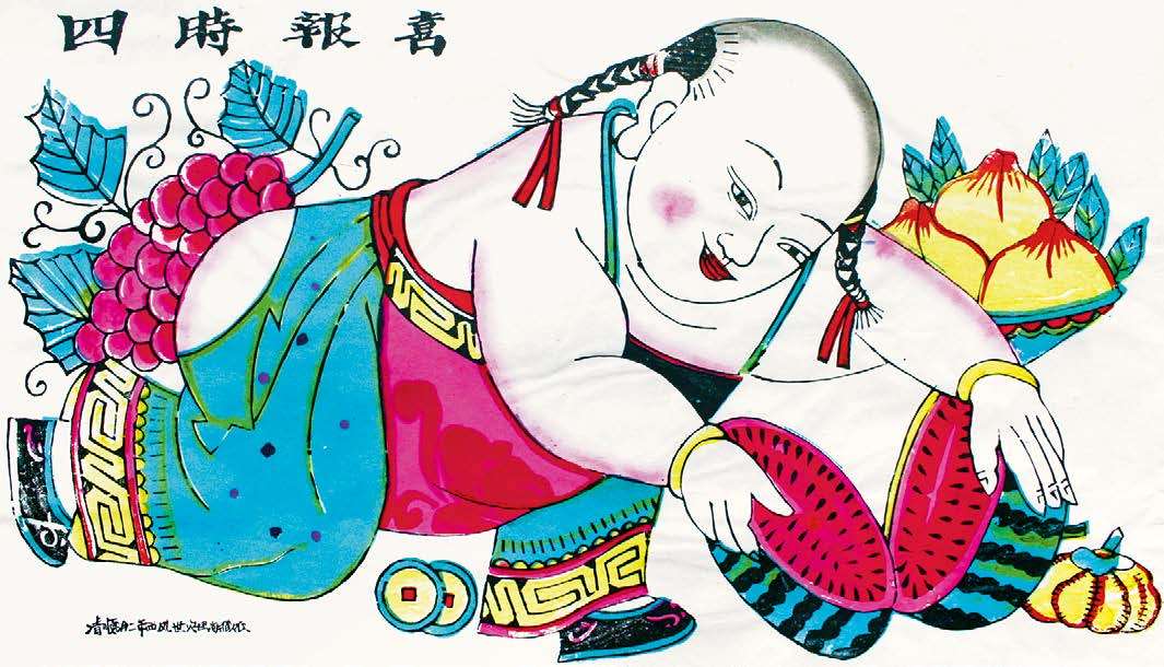 胖娃娃身边满是桃、西瓜、葡萄、百合等四季瓜果,寿桃等吉祥嘉果配以打开的西瓜,西瓜中的众多瓜子表示多子,寓意多子多寿。《四时报喜》年画祝长寿、多子多福、万代绵长、美满和睦。