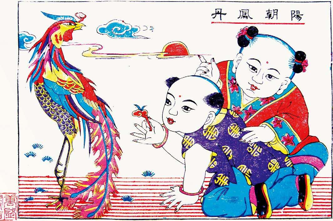 绘两个胖娃娃和凤鸟在一起,初生的朝阳从云海中冉冉升起,寓意丹凤朝阳。丹凤朝阳又称“朝阳鸣凤”。