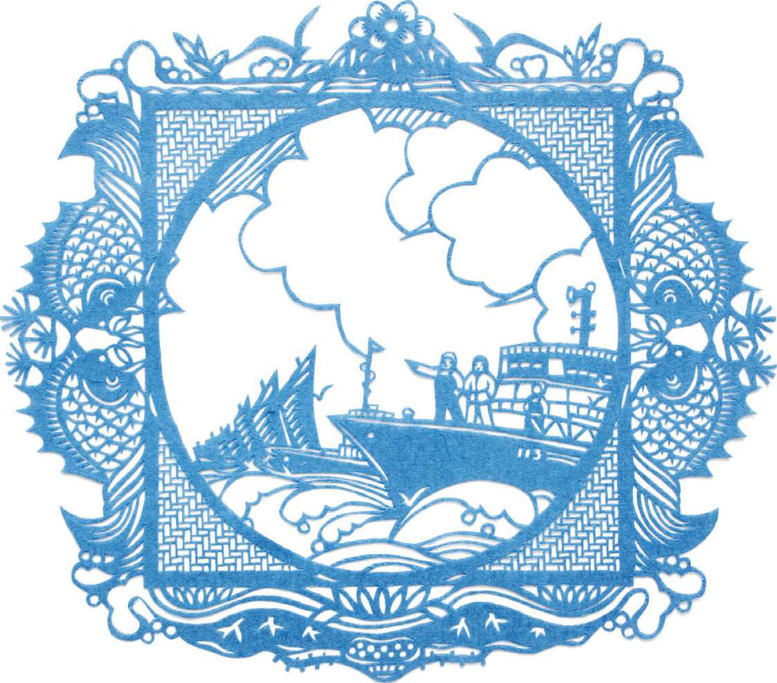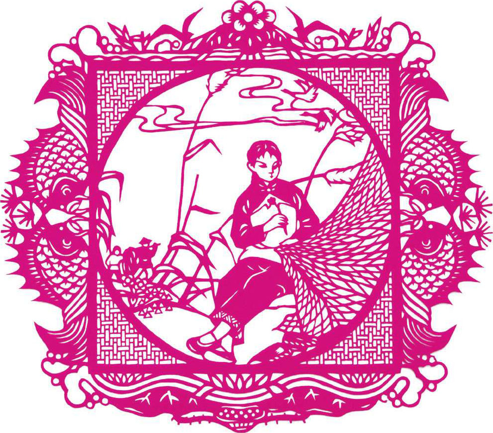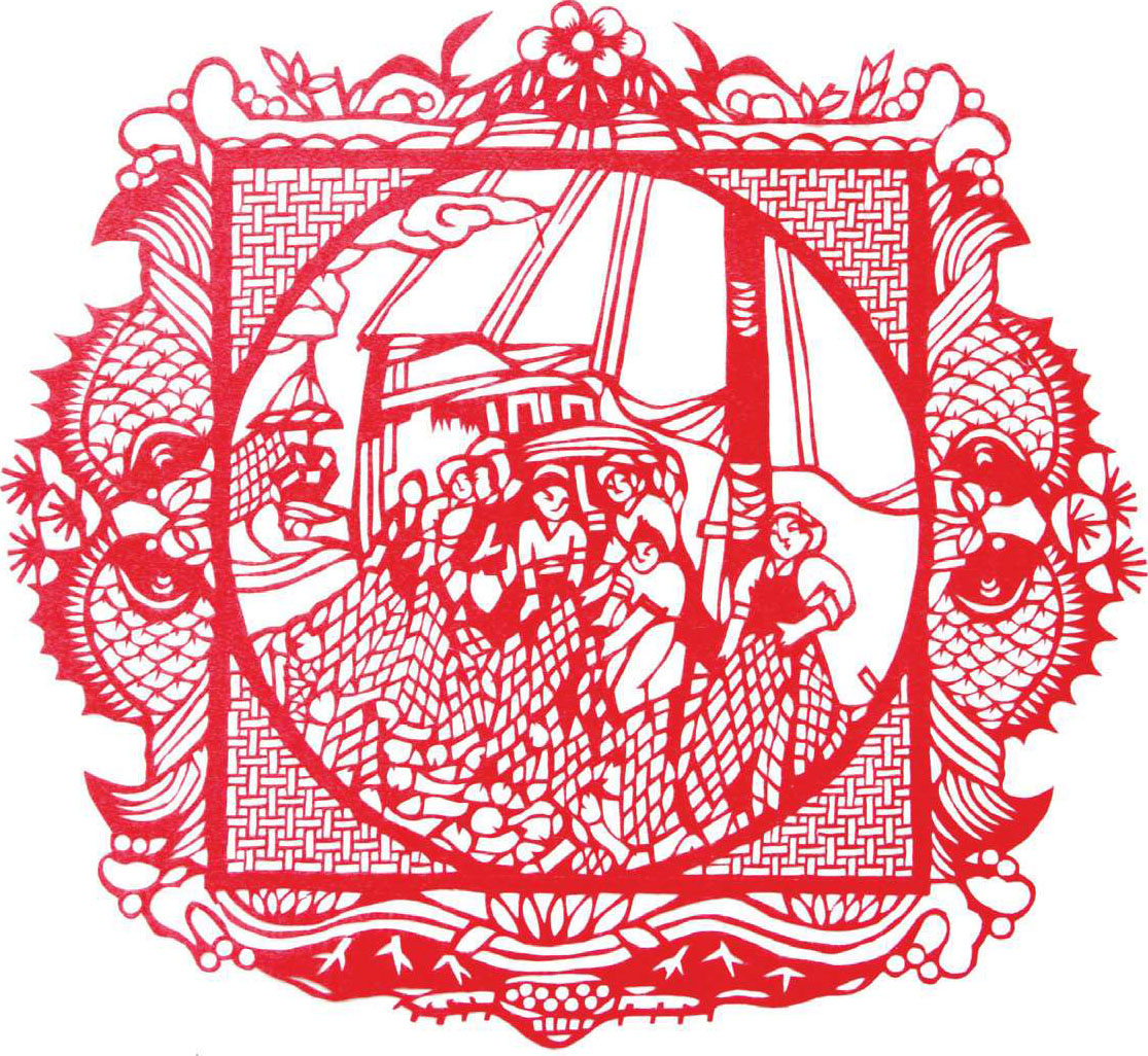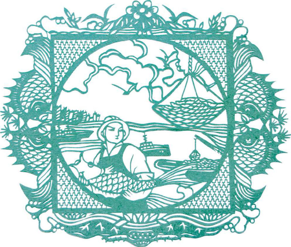 渔业是江河湖海边的人利用水域进行捕捞、养殖和加工的产业。这套剪纸表现的是渔民出海捕鱼,喜获丰收的画面,是渔业题材剪纸中的经典作品。