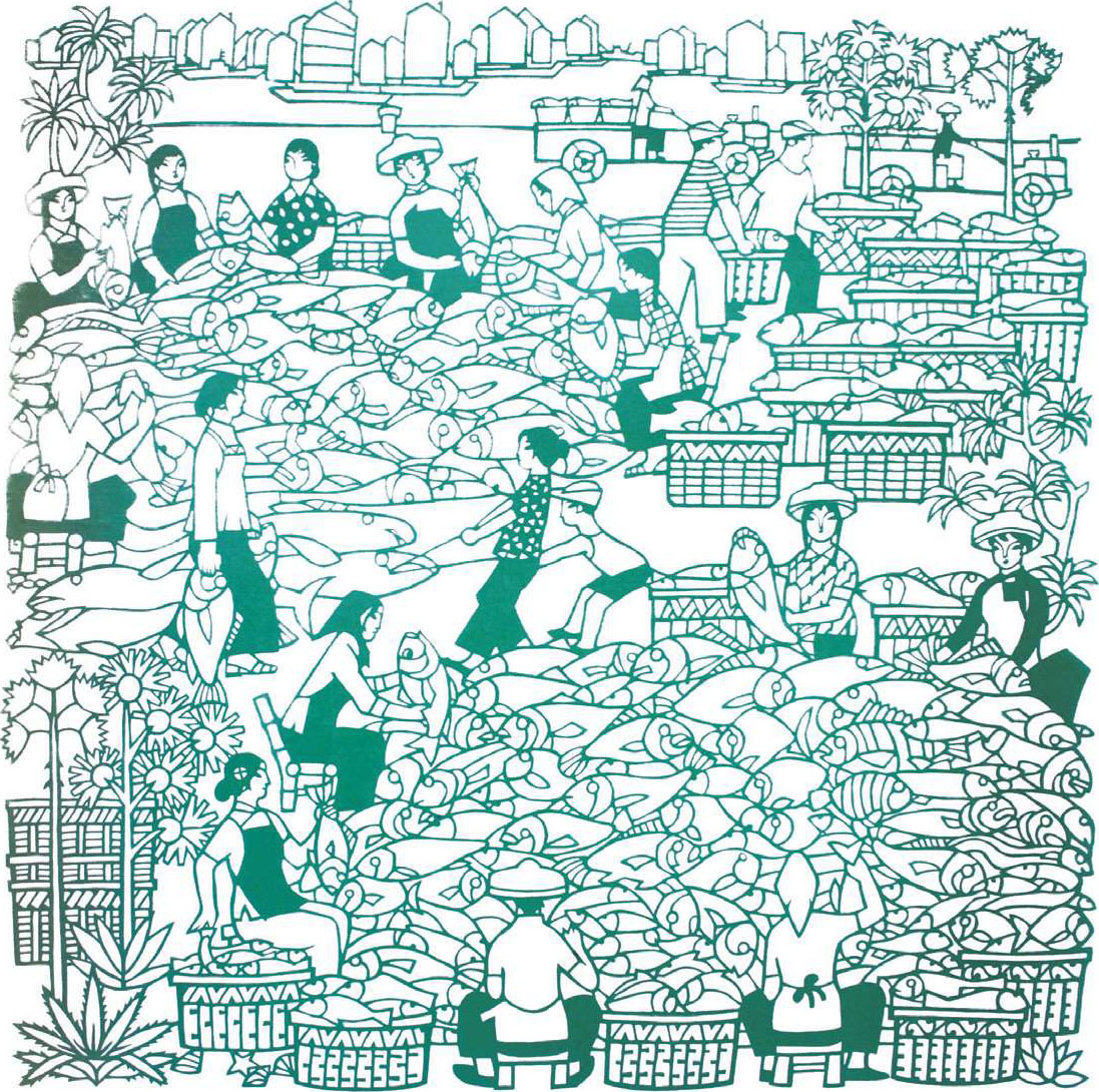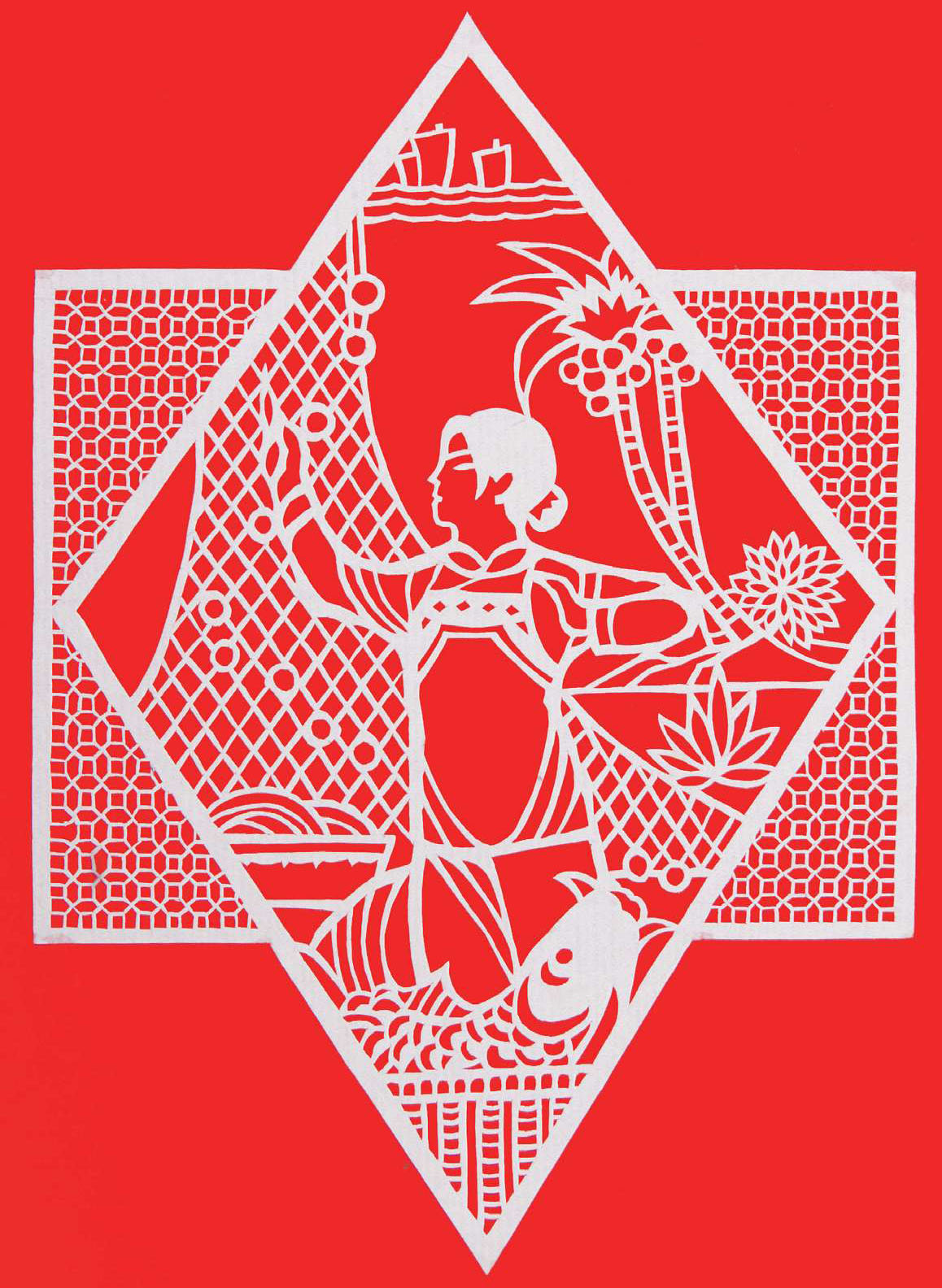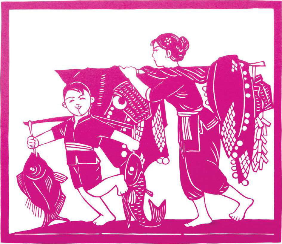 渔业是江河湖海边的人利用水域进行捕捞、养殖和加工的产业。这套剪纸表现的是渔民出海捕鱼,喜获丰收的画面,是渔业题材剪纸中的经典作品。