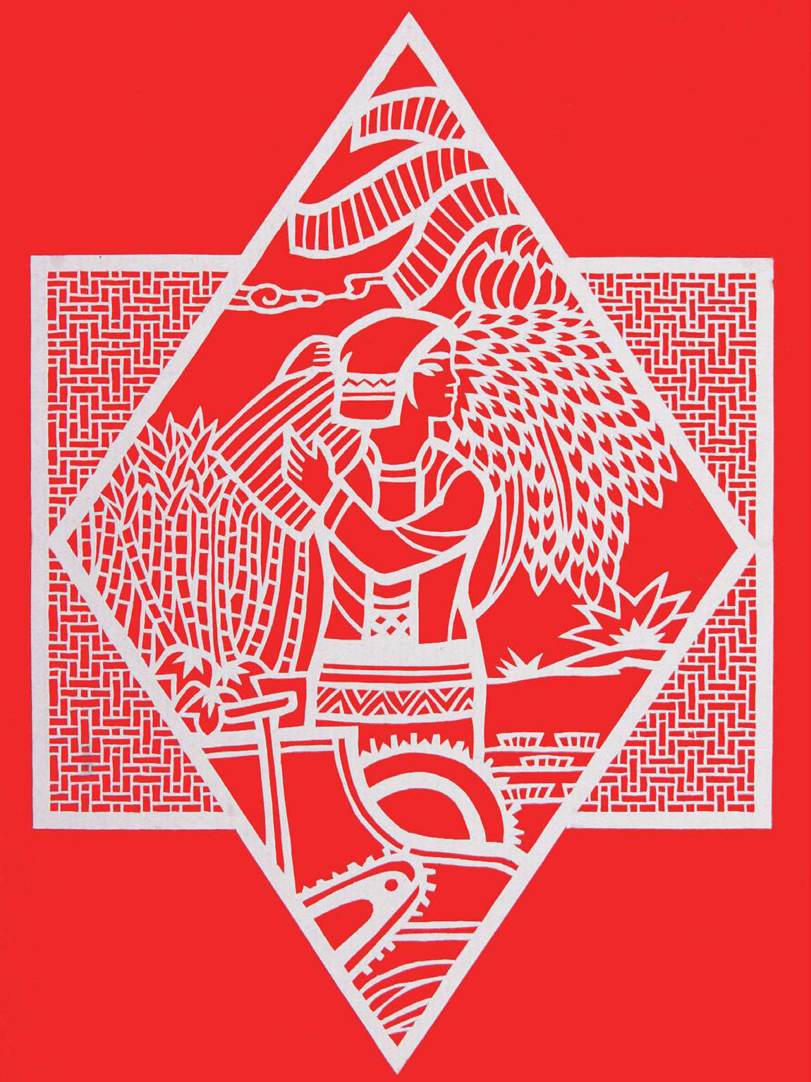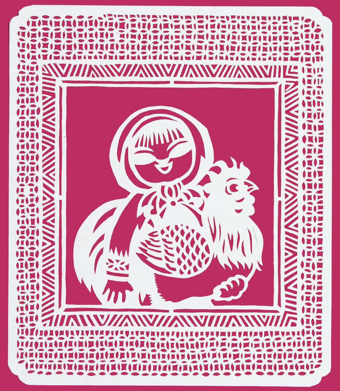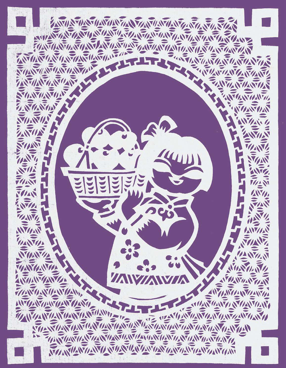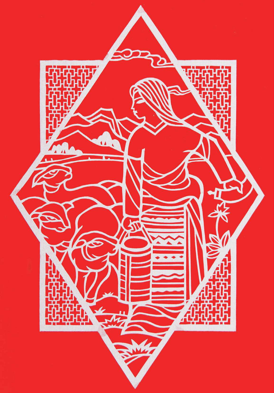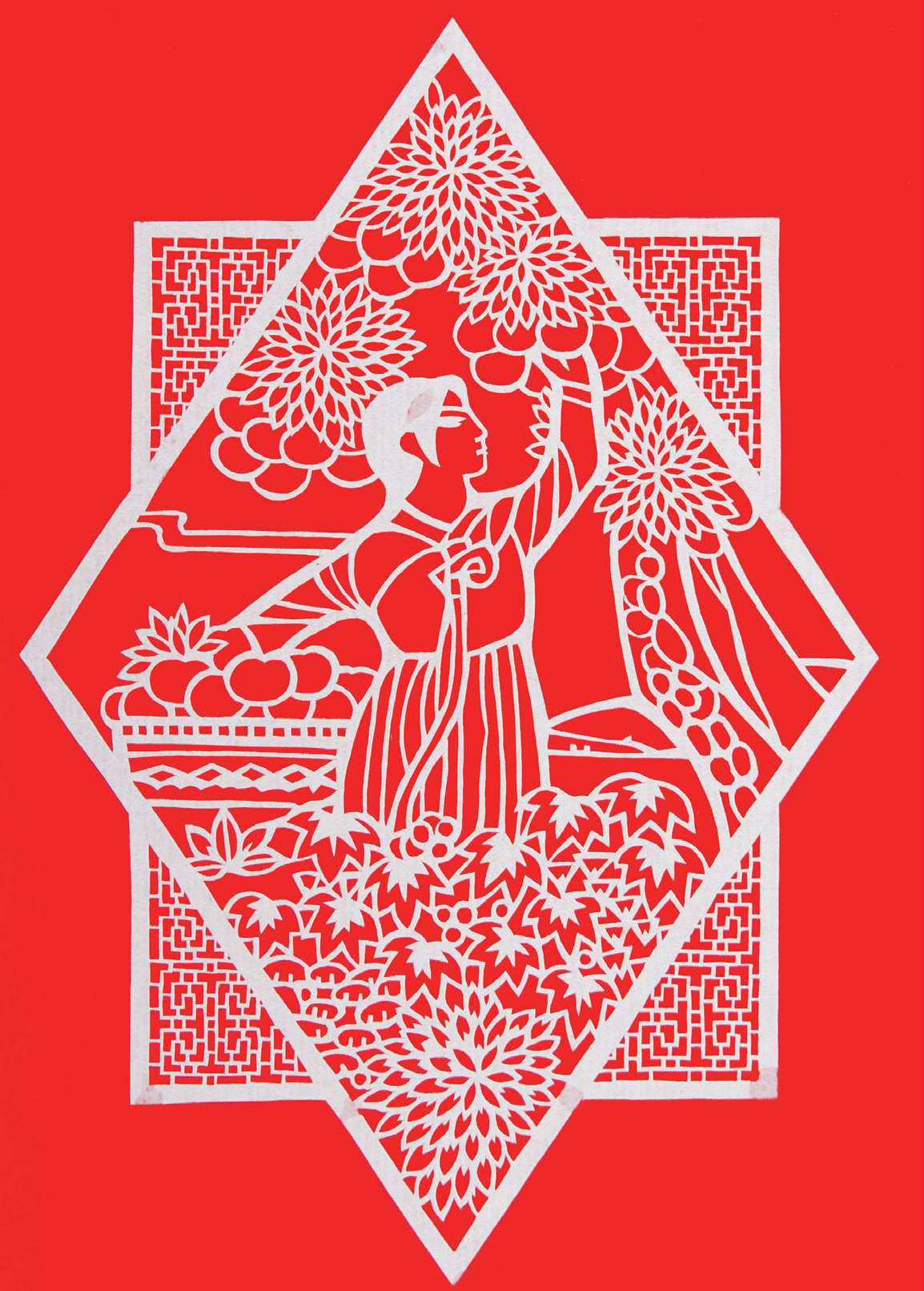 这组剪纸构图讲究,长方形和菱形交叠,其中菱形为图案,每个菱形图中表现一个劳动妇女,她们或收获麦子,或摘苹果,或养羊,或整理渔网。剪纸艺术家通过刻画她们亭亭玉立的曼妙身材,凸显勤劳纯朴的本色,表现出女性劳动之美。