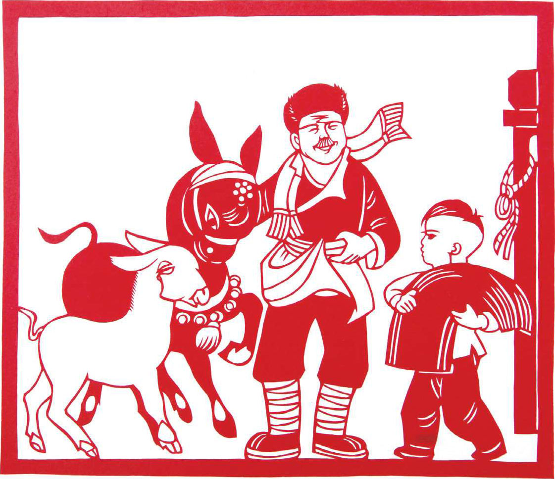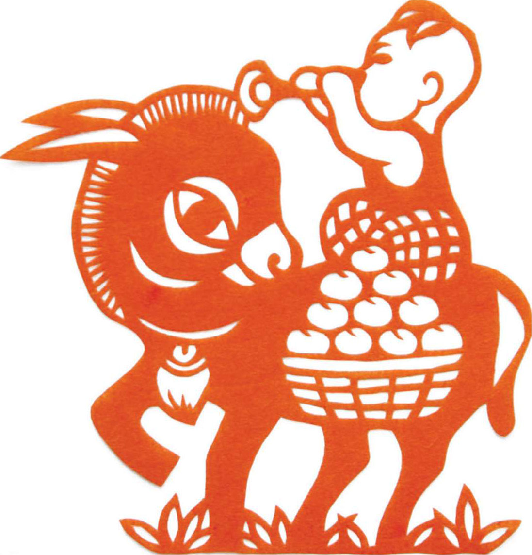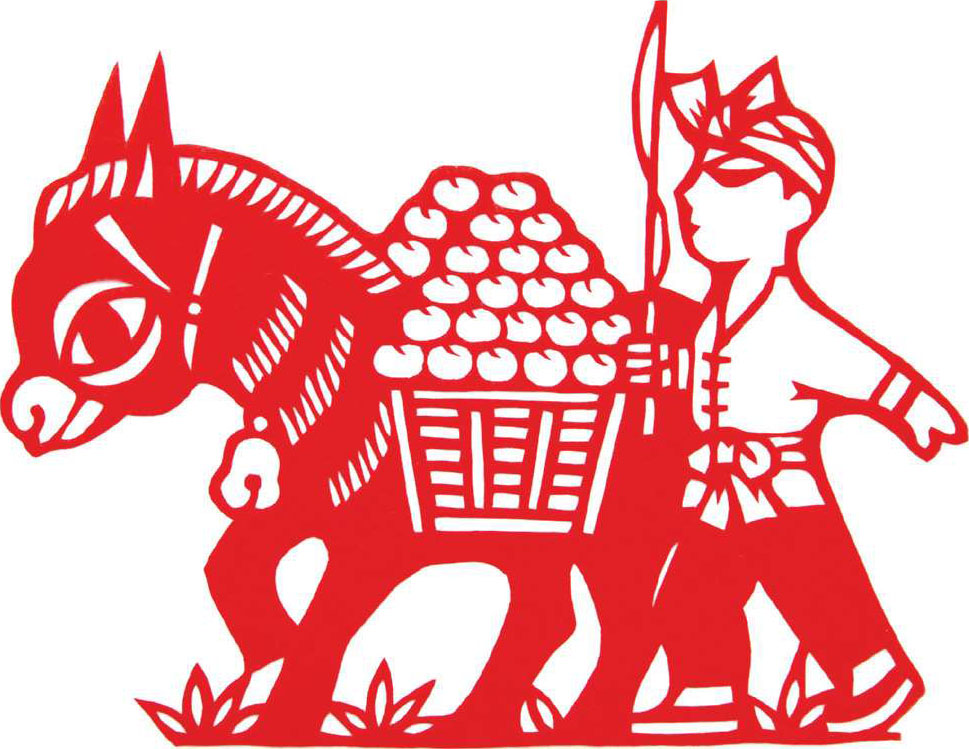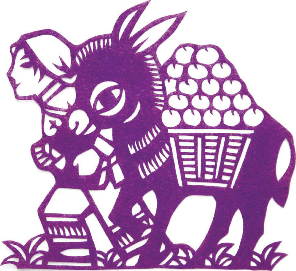 这组剪纸也叫《苹果丰收》,毛驴背上的驮篓中装满了沉甸甸的苹果,村民的脸上洋溢着丰收的喜悦。
