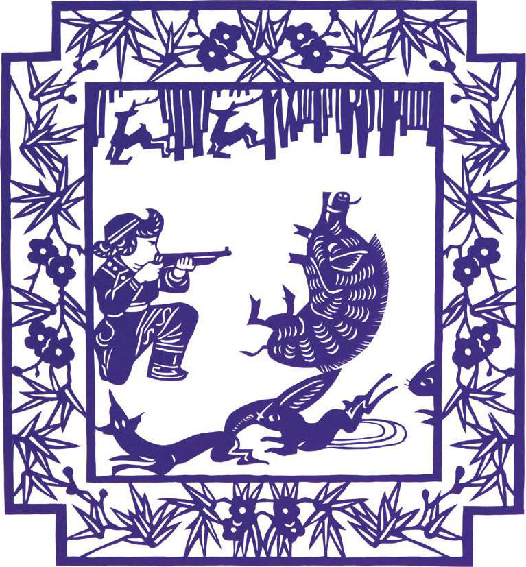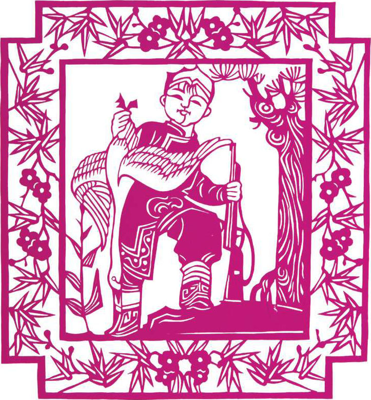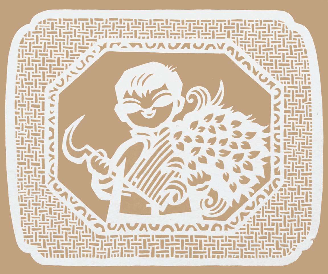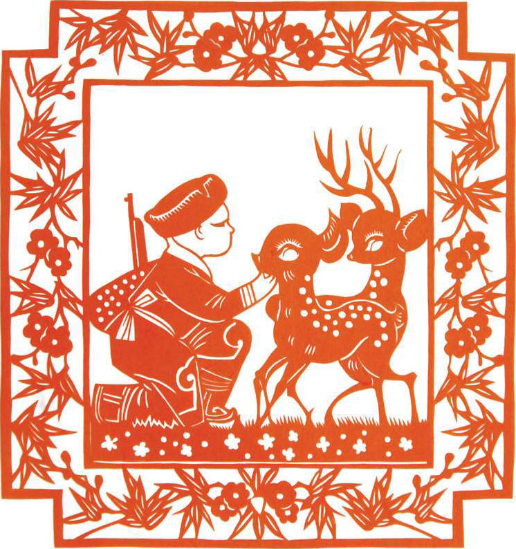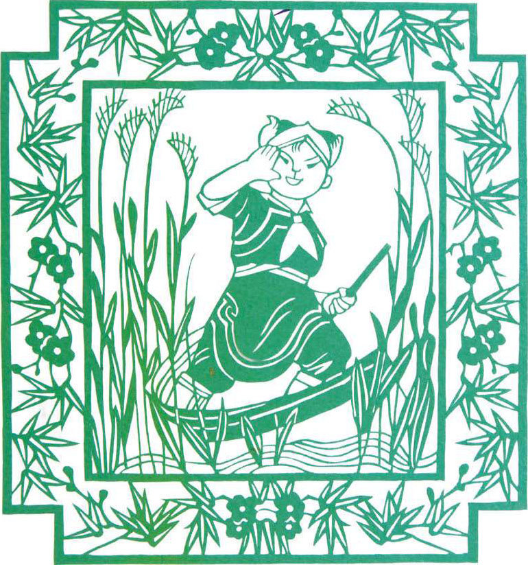剪纸名叫《边疆新歌》,是因为剪纸上刻画的是东北少数民族人民,生活在边疆。这也是那个时代的特色,当时很流行“边疆”或“边疆新歌”这个说法。其实,这组剪纸表现的内容也是典型的农林牧副渔五业。周边的竹梅等装饰花纹为这组剪纸增添了艺术魅力。