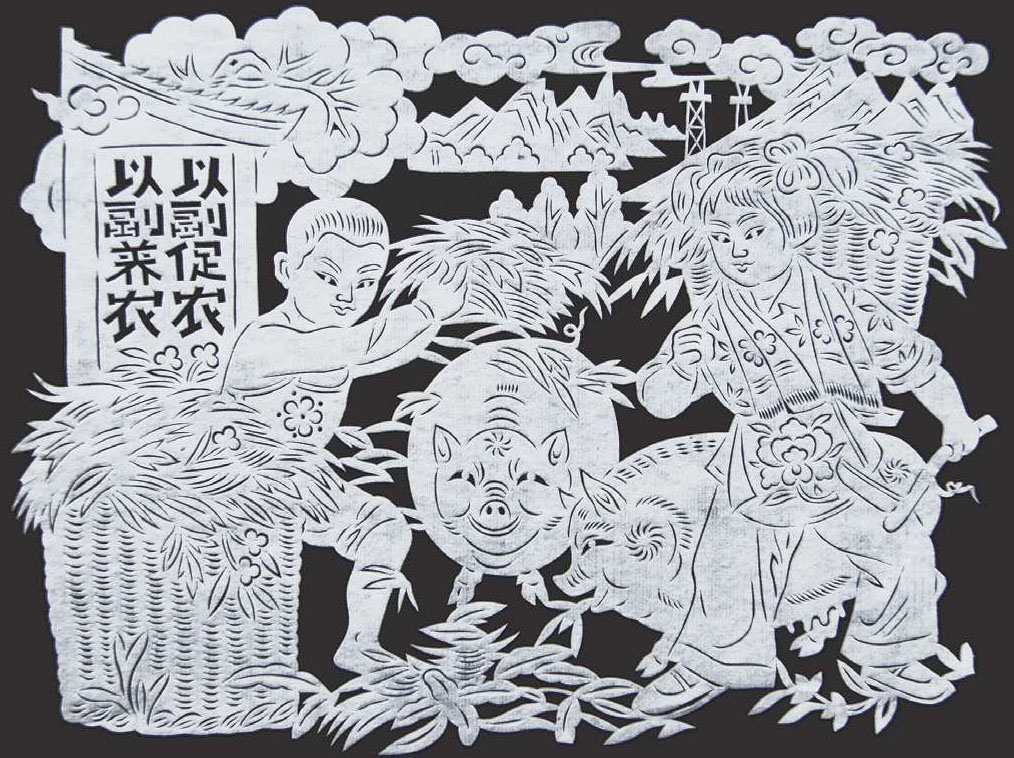 “以副养农 以副促农”是二十世纪七十年代一句响亮的宣传口号,是当时的主旋律,有大量宣传画、剪纸表现这一主题。安明的这幅作品堪称这一题材的经典之作,至今也难以找出一丝瑕疵,亦很难找到有在艺术上超越这张作品的同题材剪纸。