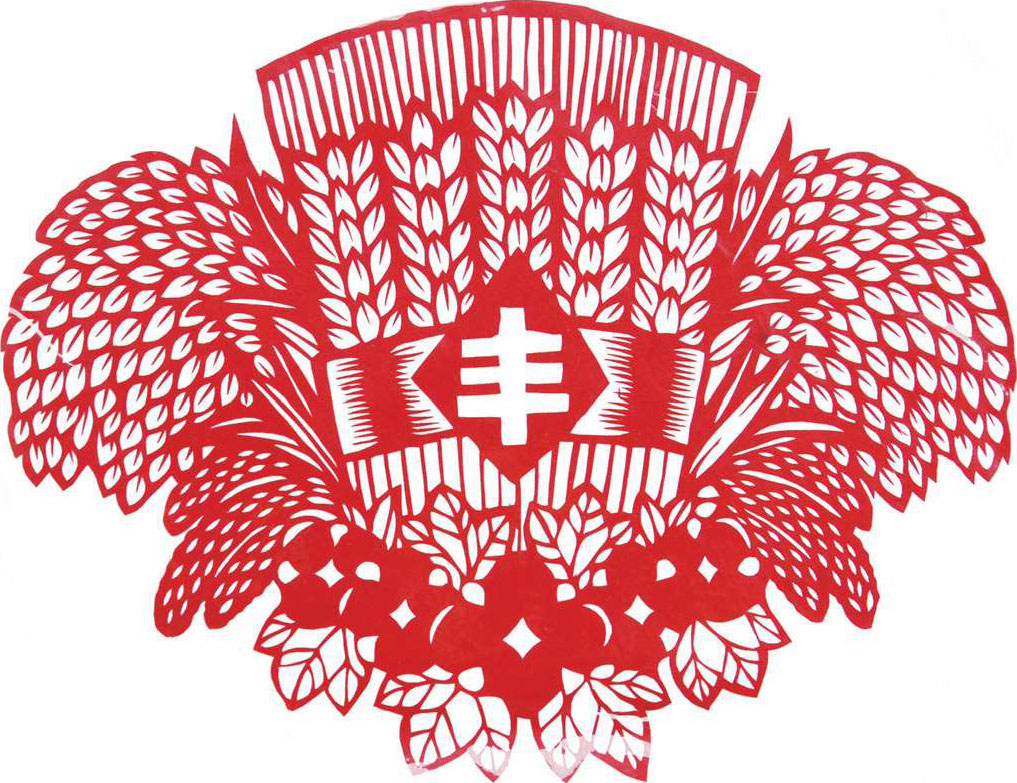 《五业丰收》剪纸将玉米稻谷、牛羊鱼鸭等构于一图,牛羊鱼鸭丰硕肥美,农作物与杨柳花木生机勃勃,好一派五业丰收的好光景!