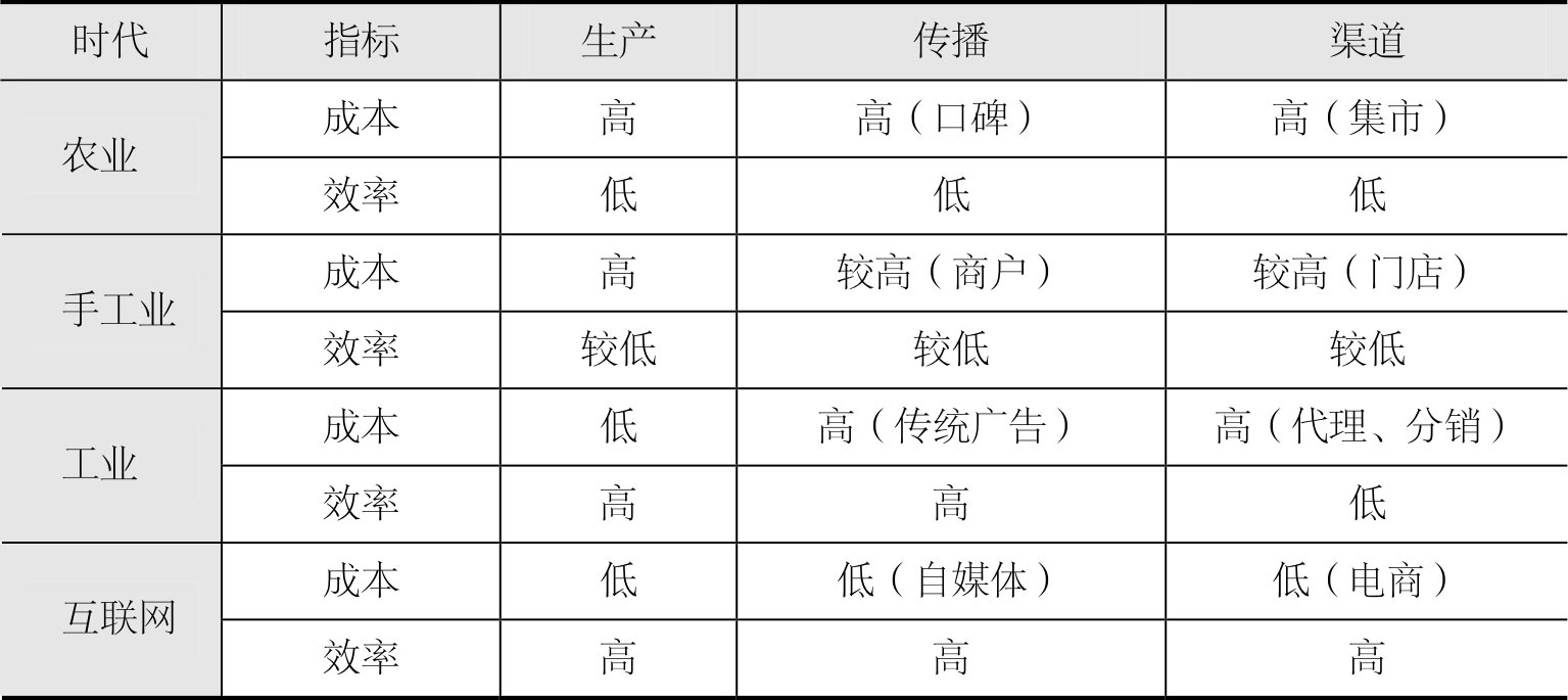 如表1-1所示,我们从工业时代说起。工业时代是一个划时代的时代,因为工业时代发生了两件大事:一个是蒸汽机的发明;另一个是泰勒提出了科学管理理论。这一硬一软两样东西极大地提高了生产环节的效率,降低了生产环节的成本,所以说,工业时代解决了两个指标,即生产环节的成本和效率问题。除了这两个指标外,我们再看看传播环节,工业时代的传播比较依赖于报纸和电视,特别是电视,一个广告播出,妇孺皆知。比如秦池酒业,央视黄金时段标王一拿,马上从一个不入流的小酒厂晋升为明星企业,酒的销售量呈几何级增长。可是巨额的广告投入对酒的品质有改善吗?没有任何改善。因此,工业时代只解决了传播环节的效率问题,没解决传播环节的成本问题。因为传播的成本过高,最终秦池酒业还是倒闭了,可谓成也广告,败也广告。最后看渠道环节,工业时代的渠道多采用的是经销商制,一层层分销,每一层都要加价,因为要付租金,养团队,还要赚取一定的利润,所以渠道的成本是很高的。除了渠道成本高,效率还很低,商品从工厂生产出来,要先转移到省级经销商的仓库,然后再从省级经销商的仓库转移到地级分销商的仓库,再转到县级分销商的仓库,最后到零售商的仓库,这一级级的转移导致效率极其低下。