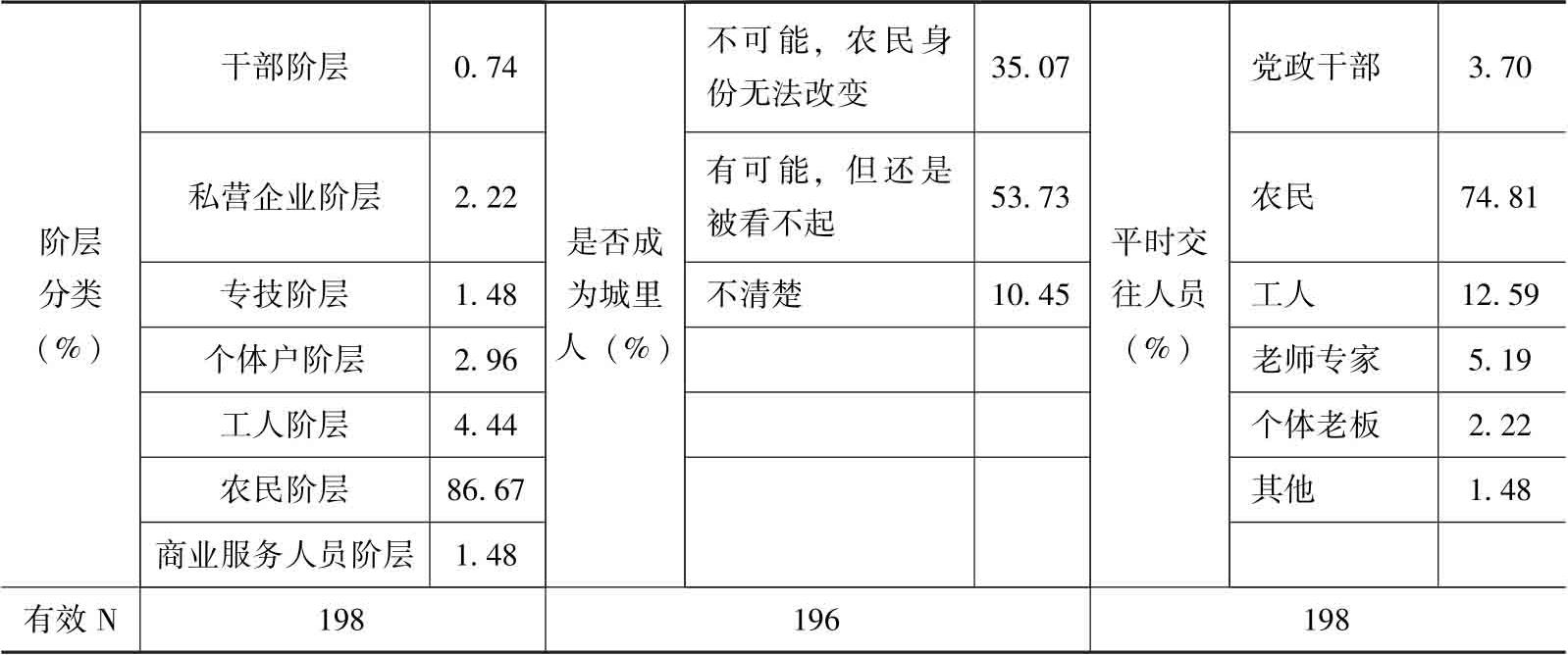 从社会阶层看,当前社会阶层多样化特征明显并有阶层固化加剧的趋势。由表3-4可知,86.67%的被访者认为自己属于农民阶层,还有35.07%的被访者认为自己根本不可能成为“城里人”,因为农民身份无法改变;有高达53.73%的被访者认为通过自身努力(如进城打工)有可能成为“城里人”,但还是被城里人瞧不起。从平时的交往群体可进一步看出,74.81%的受访者平时主要和农民交往。可以看出,被访贫困户社交空间狭隘,进一步限制了其拓展社会资本的空间。拥有资源的个人只有在社会关系网络中进行互动和交往,才有可能形成社会资本。而贫困农户一方面由于和其他群体价值观念和文化差异的存在无法进行平等交流,另一方面又迫于生存压力没有过多的闲暇时间拓展社会网络资源,由此导致其社会网络空间只能局限在有限的范围内和特定的群体。长此以往,不仅容易被主流社会边缘化,更使各阶层之间的流动受阻且不断固化,造成贫困户的社会网络资源存量仍旧停留在原有关系的基础上。