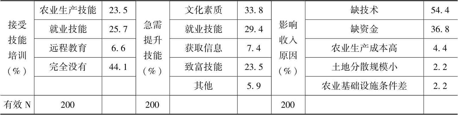 据我们调查,从健康状况看,被访户主中有14.7%的受访者认为自身的健康状况“一般”,有20.6%的受访者认为自己的健康状况“较差”,两者合计35.3%的被访户主对自身的健康状况不满意。这主要是由于贫困户长期以来的“小病拖、大病扛”导致的健康问题,医疗支出占被访贫困户家庭生活消费支出的15.84%,18.2%的被访者认为“看病支出”太高。从教育状况看,西海固地区的贫困人口中,具有初中文化水平的占建档立卡总人数的24.76%,具有初中以下文化水平(小学和文盲半文盲)的占建档立卡总人数的61.1%,其中:文盲半文盲占建档立卡总人数的17.75%,小学文化水平的占建档立卡总人数的43.35%。另外,宁夏贫困地区劳动力因缺乏劳动技能导致自我发展能力不高,在西海固地区建档立卡的贫困人口中,具有劳动技能的仅占建档立卡总人数的1.02%。由表3-3可知,贫困农户接受过农业生产技能培训的为23.5%,接受过就业技能培训的为25.7%,完全没有接受过任何技能培训的高达44.1%。从贫困户急需提升的技能看,文化素质、就业技能和致富技能排在前3位。从影响贫困户收入的因素看,“缺技术”因素占到54.4%。可见,贫困户技能缺乏仍是影响其就业难的主要原因。