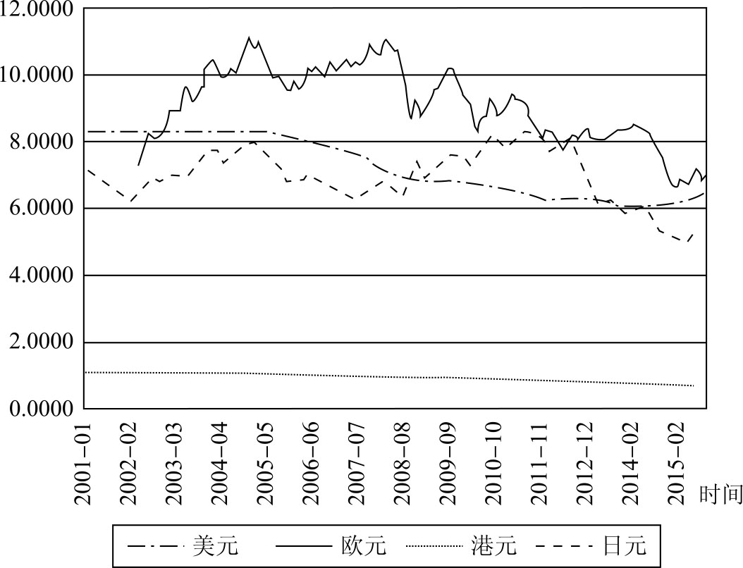 从图2.15中人民币与主要货币汇率变动情况可以看到,由于港币也是钉住美元,因此人民币与港币汇率基本稳定。但是,由于欧元和日元对美元是自由浮动的,因而在2001年至2015年,人民币兑欧元和日元汇率仍然表现出较大幅度的波动。