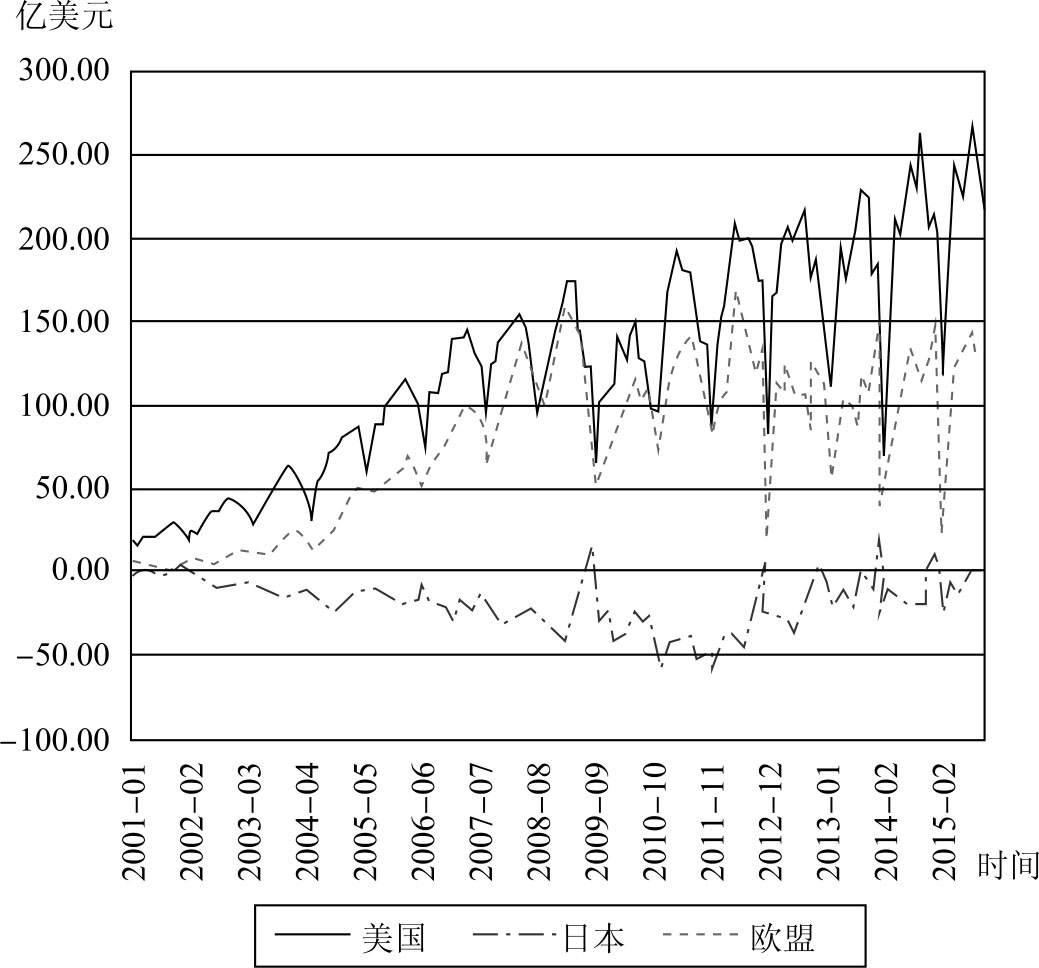 由图2.16可以看到,虽然2005年人民币对美元汇率体制进行了第二次改革,并进行了一系列调整,而且之后人民币不断升值,但是在2001年到2015年,中国对美国的贸易顺差却一直呈现增长趋势。虽然在2008年美国金融危机期间顺差水平有所下降,但是随后很快恢复增长趋势。人民币对欧元汇率虽然也有较大幅度的波动,但是在2001年到2009年,中国对欧盟的贸易顺差也快速增长,随后保持在较高的水平上。在2001年至2015年,中国对日本的贸易差额主要是逆差,而在此期间人民币对日元汇率出现了波动中升值的趋势。