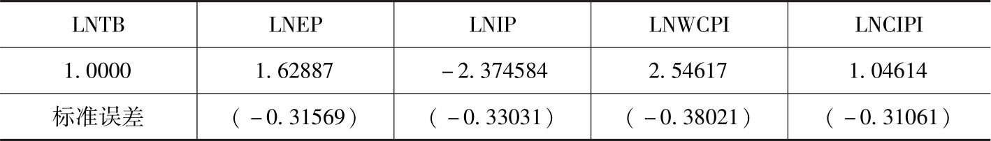 在确定VAR协整检验的滞后阶数时,根据滞后长度判别检验进行判断。同时考虑到有效估计的残差应该具有正态分布特征,确定VAR模型的滞后期数为3。采取带截距项和趋势项的检验模型对向量 Ft =( LNTB t , LNEP t , LNIP t , LNCIPI t , LNWCPI t )进行协整检验。协整关系检验的结果见表4.5。