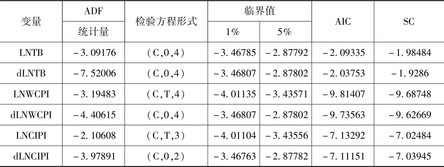 注:检验方程形式(C, T, d)中C表明检验方程带有常数项,T表明带趋势项。d为滞后期数,选择标准是AIC和SC准则。检验计量软件为Eviews6.0。