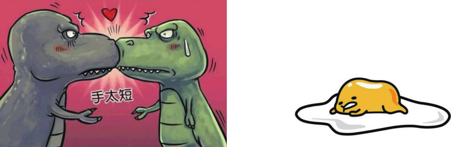“蠢萌”自身有一些缺陷,导致有些动作看上去比较蠢。但是这些缺陷或比较蠢的动作,却让它们看上去很可爱。一些简单的小漫画,就会让它们顿生妙趣,让人过目不忘。例如,霸王龙和蛋黄哥。