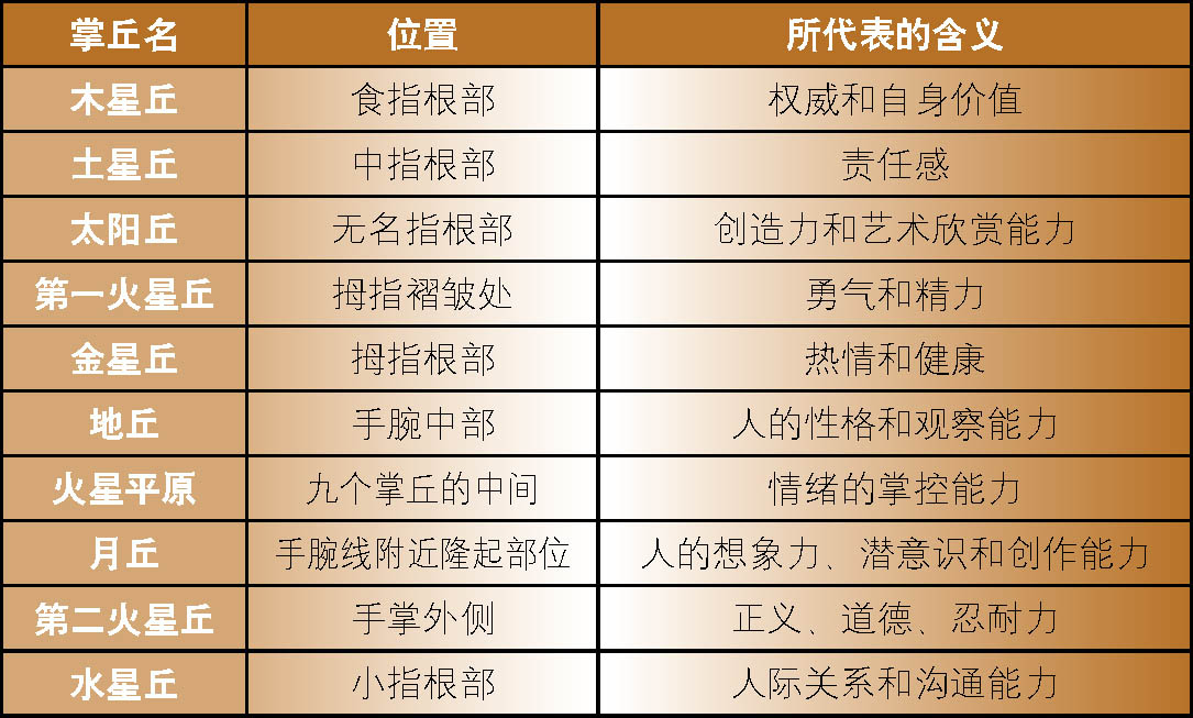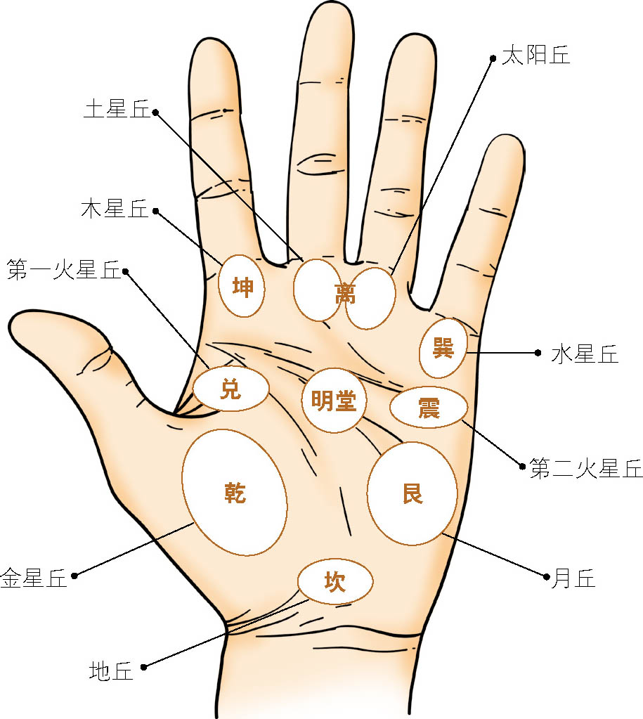 掌丘是指手掌上较凸起的部分,因形似小山,所以叫做“掌丘”。古代相术学中将九个掌丘分别对应八卦,并赋予不同的寓意。