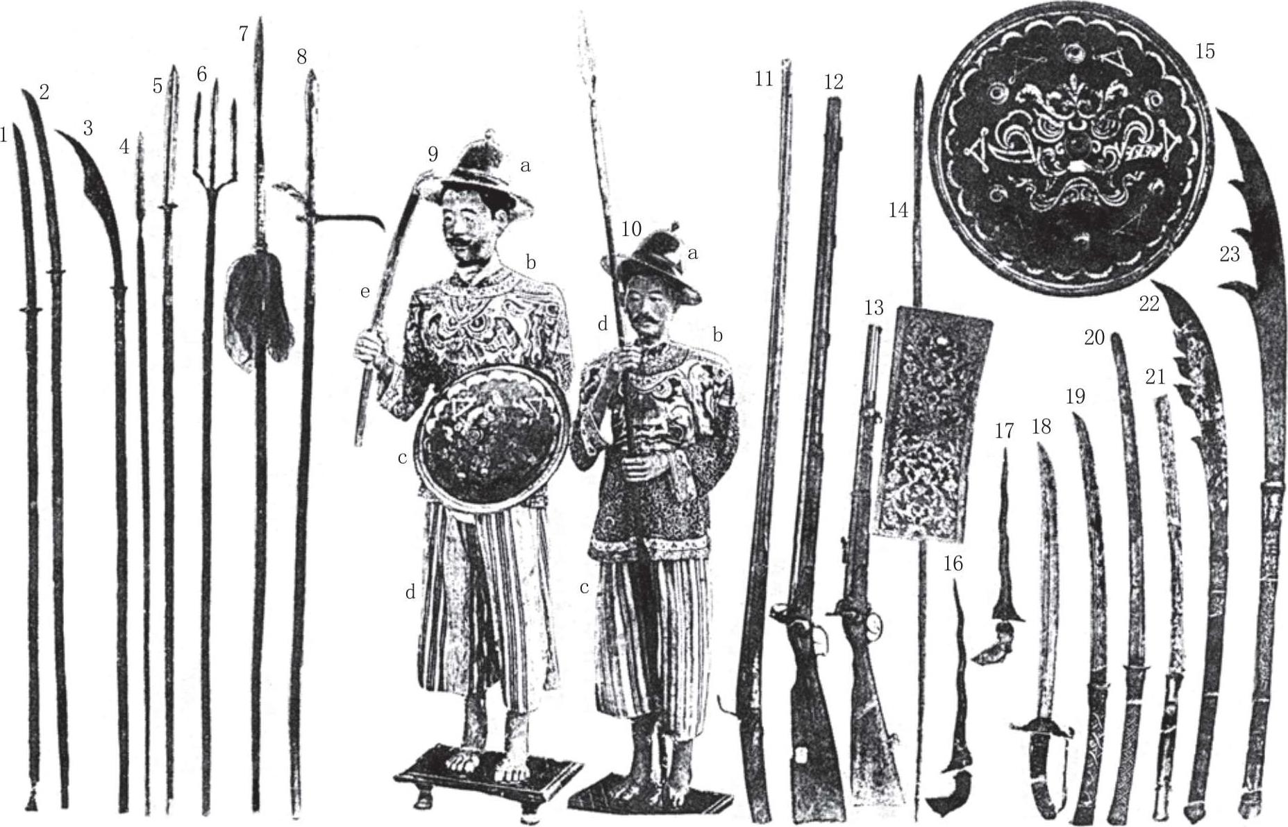 1—3.长柄大刀。4.标枪。5.矛。6.三齿叉。7.带缨长矛。8.象兵所用戈之9—10.泰国古代士兵装束。11.鸟枪(火绳抢)。12.燧石发火枪。13.铜帽发火枪。14.盾及竹杆长矛。15.铜质圆盾。16—17.克力士短剑。18—20.腰刀。21.战刀。21—23.刃刀。(采自泰国原教育部部长所提供之图发片)