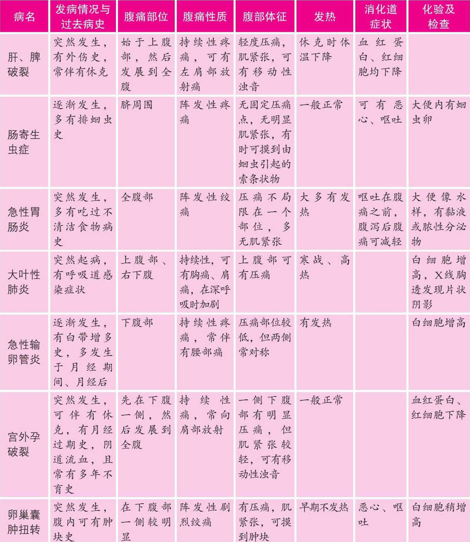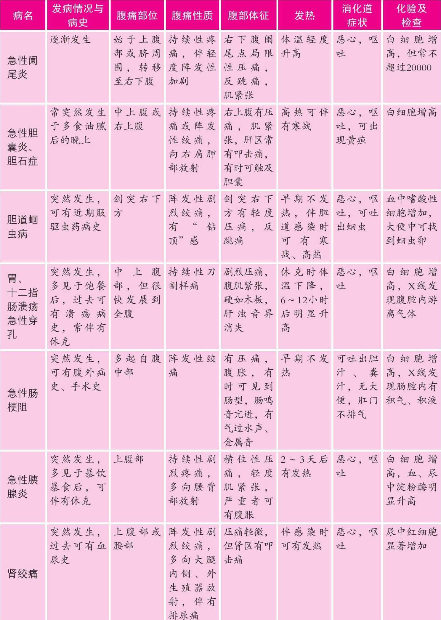 (2)腹痛时间:突然发生的腹痛,常见有胃溃疡穿孔、肠梗阻、胆道蛔虫病等;逐渐加剧的腹痛,常见的则为急性阑尾炎、急性胆囊炎等。