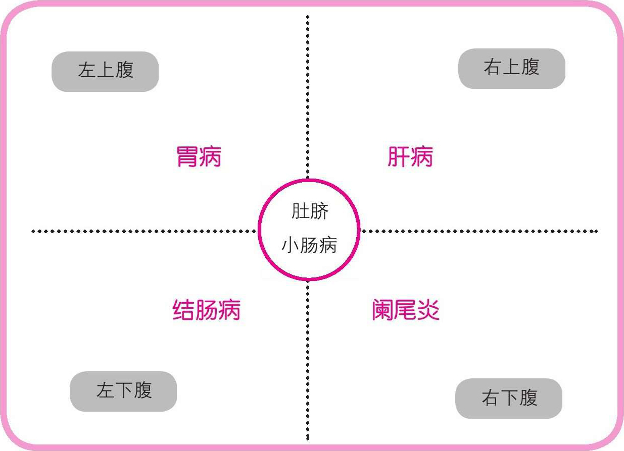 左上腹部疼痛多为胃病;右上腹部疼痛多为肝病;右下腹部疼痛多为回肠部的疾患;左下腹部疼痛多为结肠的疾患;脐周围疼痛多为小肠的疾患。