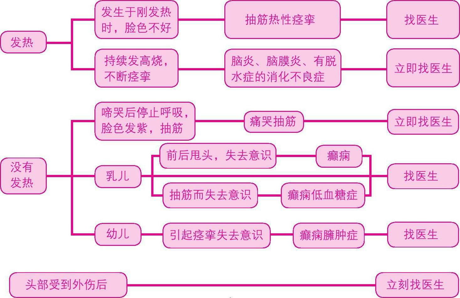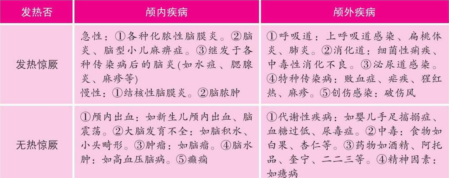 2.无热惊厥大多为代谢性疾病,如手足搐搦症、血糖过低等;少数为颅内病灶,如脑瘤、颅内出血、大脑发育不全或外伤(如脑震荡);或中毒,如白果中毒、酒精中毒;或癫痫等。