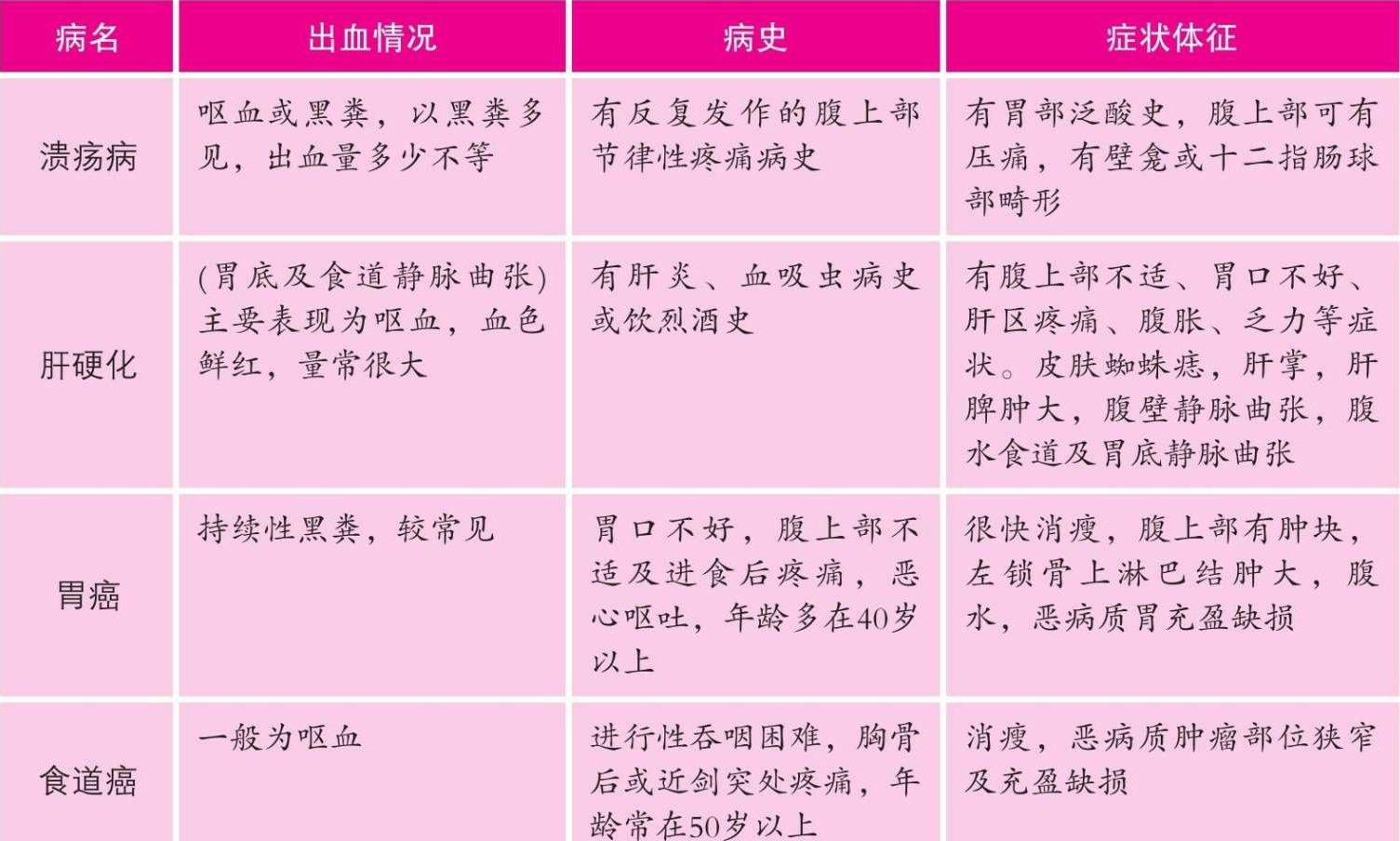 1.呕出鲜红色(或紫褐色)血液,或赤豆汤一样的液体,排出漆黑色的成形大便或稀糊成柏油样的大便。