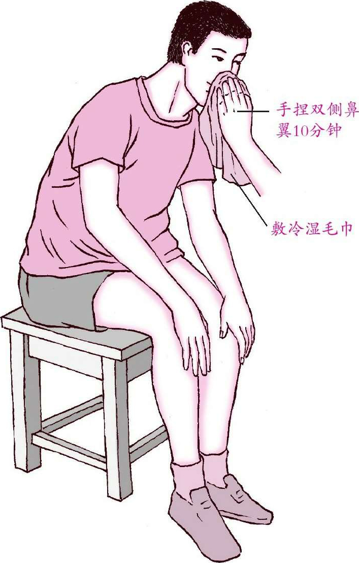 流鼻血时,正确的做法应当是:坐下来,全身放松,用手指压着流鼻血的鼻子中部5~10分钟(利用鼻翼压迫易出血区)。患者头部保持直立位,因为头低可引起头部充血,头仰可使血液流向咽部。口中的血液应尽量吐出,以免咽下刺激胃部引起呕吐。指压期间用冷水袋(或湿毛巾)敷前额及后颈,可促使血管收缩,减少出血。