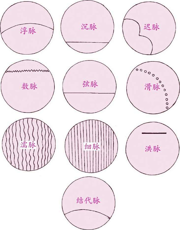 正常人的脉搏,一呼一吸之间4~5次,每分钟60~80次,因为古代没有钟表,所以医生以自己的呼吸来计数病人的脉搏。正常时,脉搏比较平稳,如果患病时,脉搏会变化,常见的脉象有以下十种。