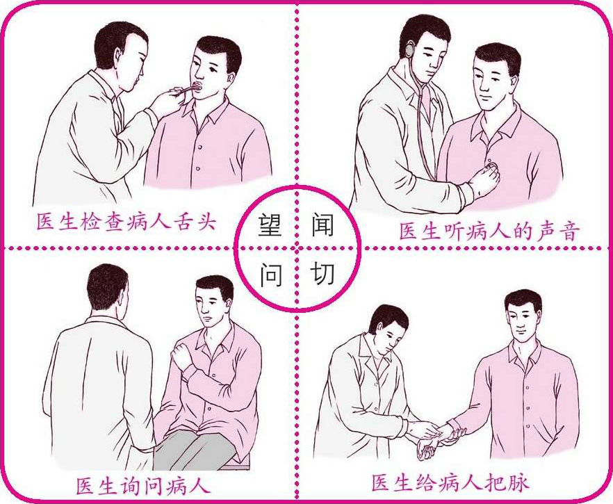 望,指观气色;闻,指听声息;问,指询问症状;切,指摸脉象。合称四诊,是中医治疗必需的步骤。