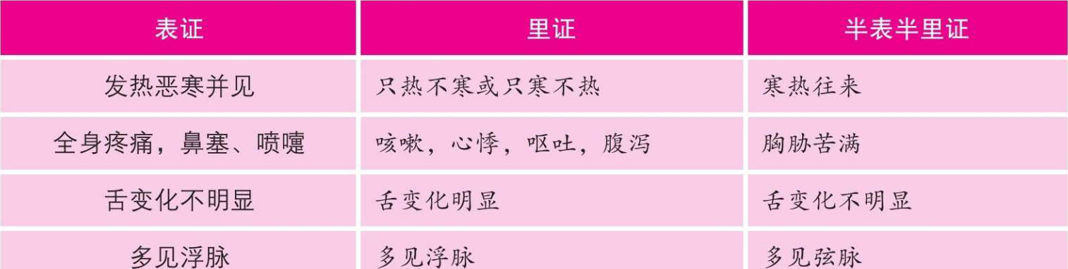 凡病在人体的肌肤、经络的,都属于表证的范围;病在脏腑的,都属于里证的范围。表证用发汗、解表、疏通经络等方法,里证治法在“病邪辨证”与“脏腑气血辨证”中介绍。