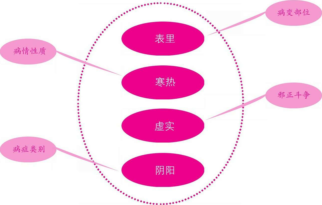 古代医学中常用表里、寒热、虚实、阴阳等名词来概括疾病的不同性质,称为“八纲辨证”。