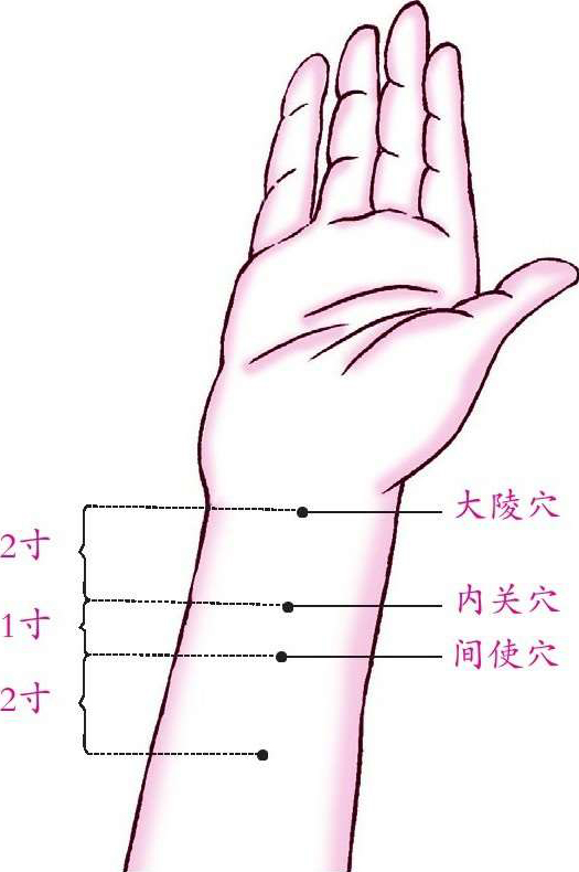 因小恙引起呕吐,可用中指压内关穴止呕。内关穴在掌后(掌面方向)2寸处尺、桡骨之间,压至有酸胀感即说明已中穴位,约1分钟即止呕吐。