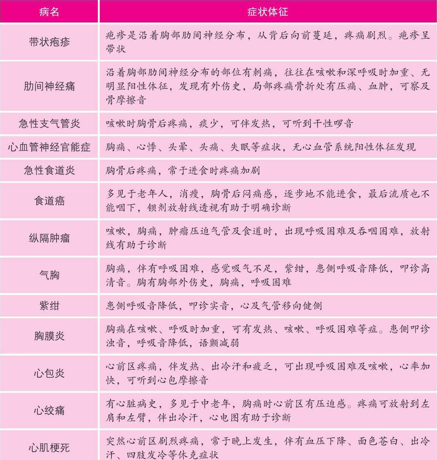 包括胸壁的挫伤、肋软骨炎、肋骨骨折、皮炎、肌炎、肌间神经炎、带状疱疹等。