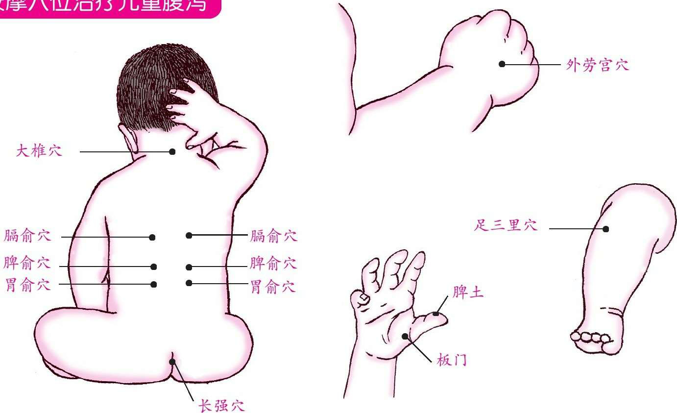 任选以上穴位的一穴或者多穴进行按摩治疗均可缓解儿童腹泻症状。