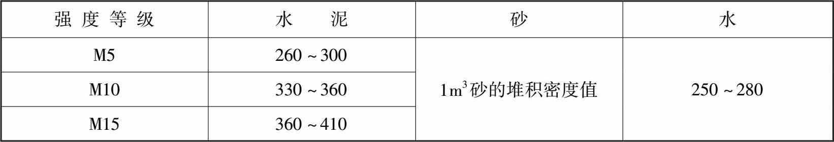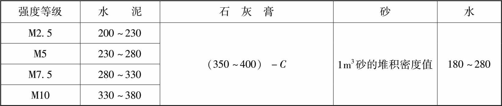 (3)水泥石灰抹灰砂浆配合比的材料用量可参照表1-5。