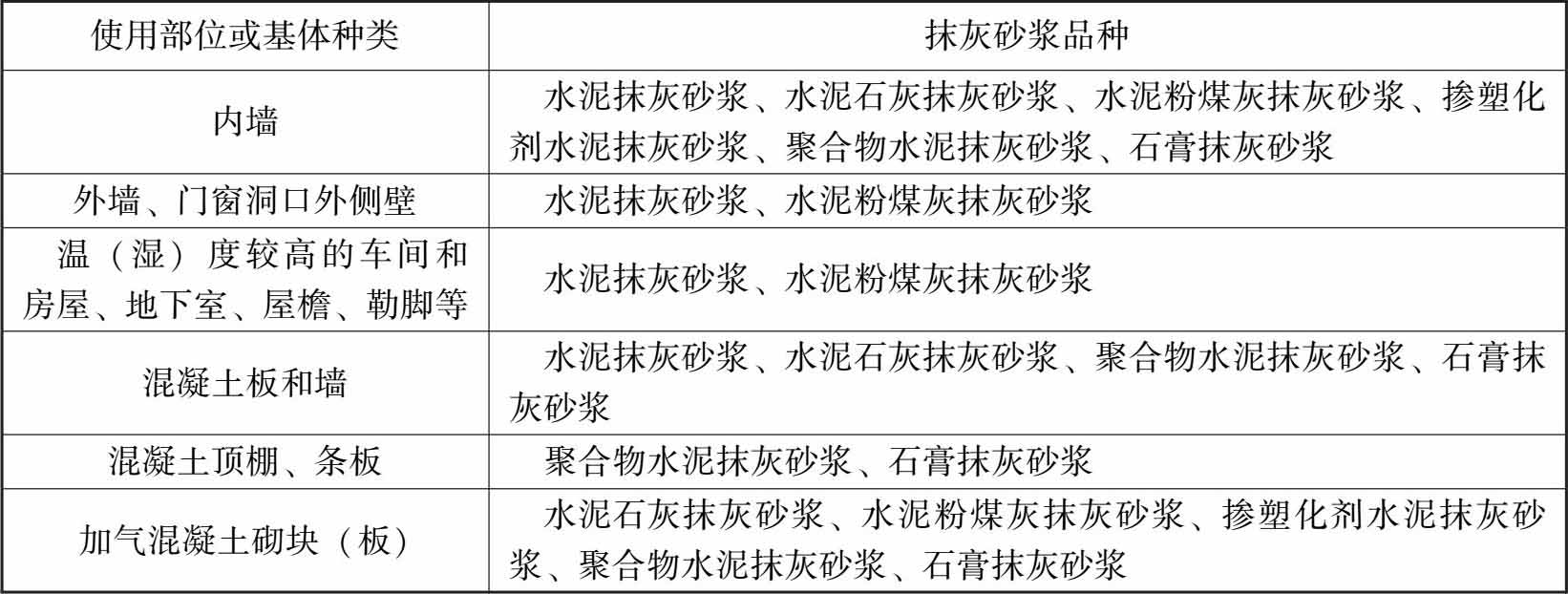 表1-1 抹灰砂浆的品种选用