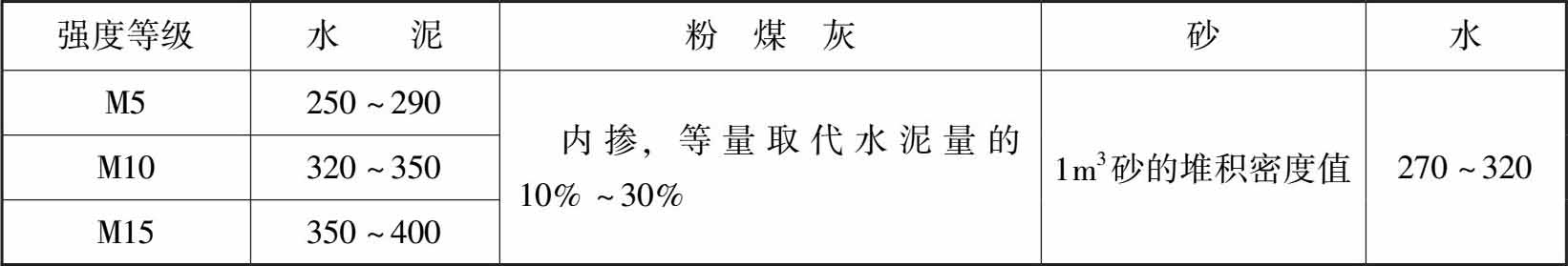 (2)水泥粉煤灰抹灰砂浆不同配合比的材料用量可参照表1-4。