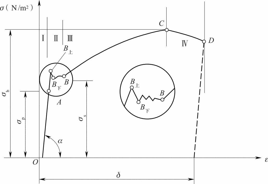 (2)屈服阶段 图中的 B 上 B 段。应力超过弹性阶段,达到某一数值时,应力与应变不再成正比关系,在 B 下 B 段内图形成呈锯齿形,这时应力在一个很小范围内波动,而应变却自动增长,犹如停止了对外力的抵抗,或者说屈服于外力,所以叫作屈服阶段。