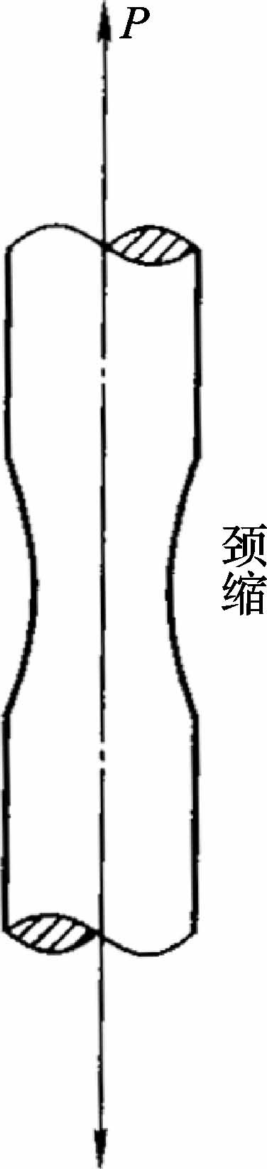 (4)颈缩阶段( CD )如图1-17中的 CD 段,当试件强度达到 C 点后,其抵抗变形的能力开始有明显下降,试件薄弱部件的断面开始出现显著缩小,此现象称为颈缩,如图1-18所示。试件在 D 点断裂,故称 CD 段为颈缩阶段。