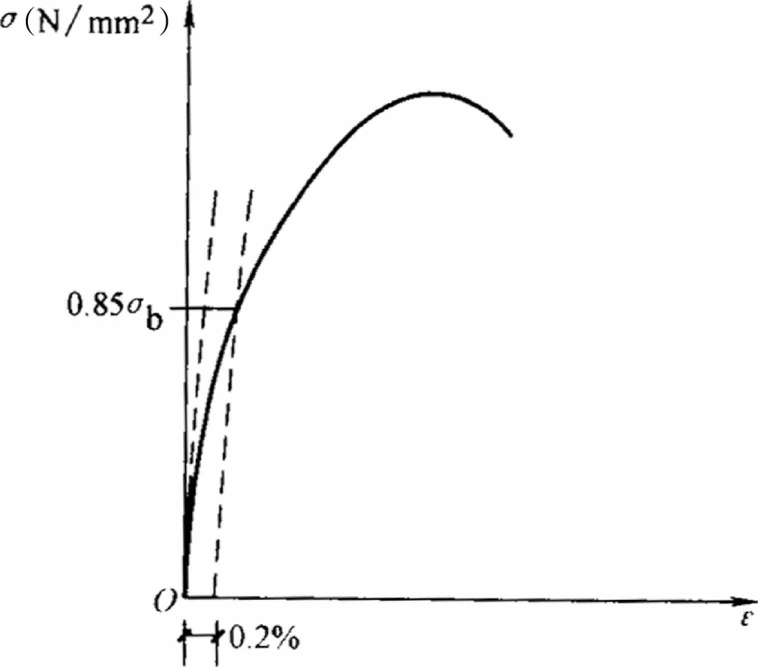 硬钢(高碳钢-余热处理钢筋和冷拔钢丝)的应力-应变曲线,如图1-19所示。从图上可看出其屈服现象不明显,无法测定其屈服点。一般以发生0.2%的残余变形时的应力值当作屈服点,用“ σ 0 .2 ”表示, σ 0.2 也称为条件屈服强度。