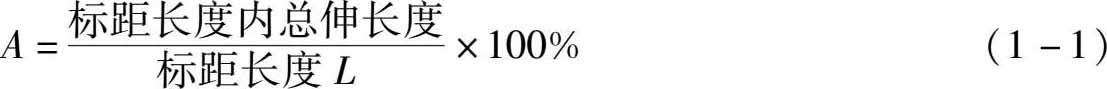 由于试件标距的长度不同,所以伸长率的表示方法也不一样。一般热轧钢筋的标距取10倍钢筋直径长和5倍钢筋直径长,其伸长率分别用 A 10 和 A 5 来表示。钢丝的标距取100倍直径长,用 A 100 表示。钢绞线标距取200倍直径长,用 A 200 来表示。