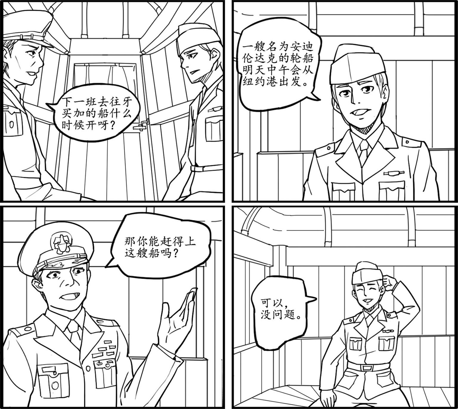 第二天早上9点我登上了牙买加的领土,并设法四处寻找古巴军人的联络处。功夫不负有心人,很快我就找到了,因为牙买加是中立国,古巴军人的行动是公开的,因此我很快就和他们的指挥官拉伊先生取得了联系。在那里,我和他一起讨论了如何才能尽快地把信送到加西亚将军的手里。