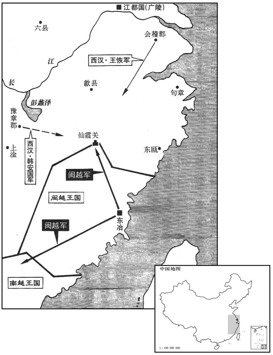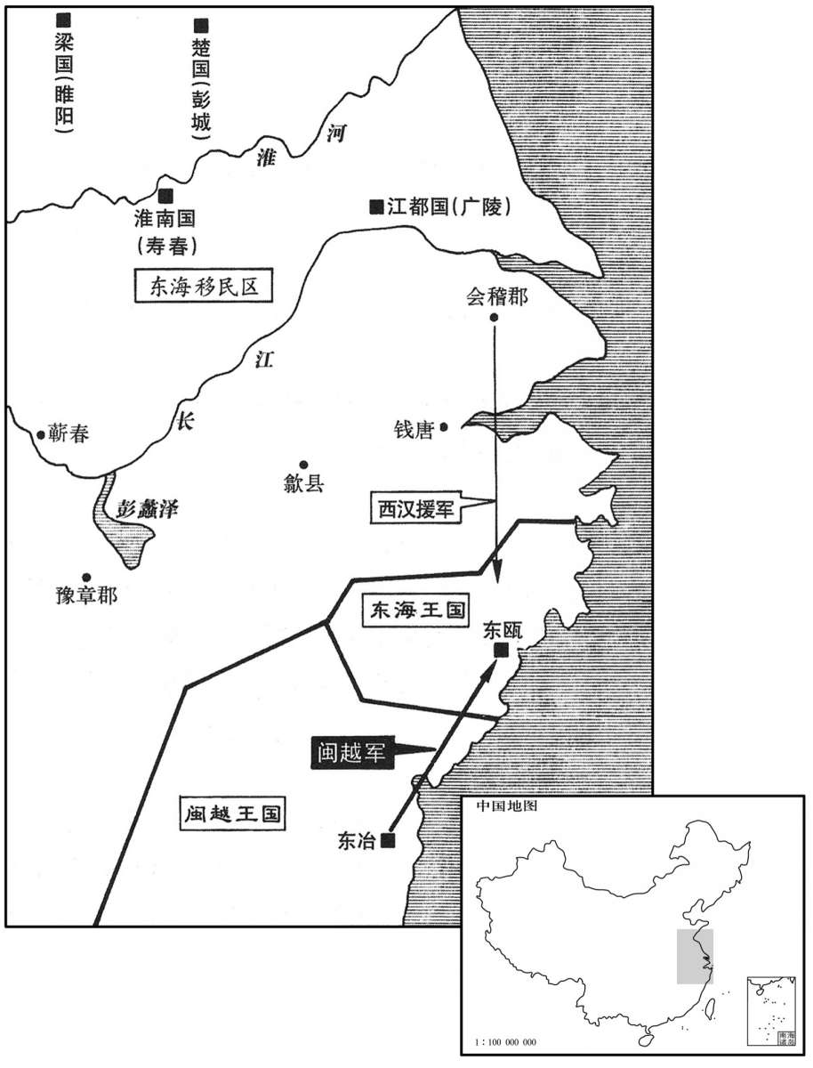 6、 七国之乱末期 (参考前一五四年) ,吴王 (首府广陵〔江苏省扬州市〕) 刘濞的太子刘驹,逃到闽越王国 (首都东冶〔福建省福州市〕) ,深恨东海王国 (首都东瓯〔浙江省温州市〕) 诱杀他的老爹,不断鼓励闽越攻击东海。本年 (前一三八年) ,闽越王国终于发动攻击,包围东瓯,东海国王骆望派人向汉朝请求援救。
