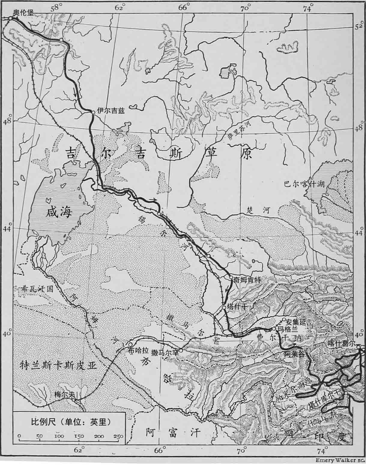 我们行路之中的歇脚点通常是一些小而坚固的木屋,门上有两条灯杆,一块白色的公告牌上按照方向写着前往下一个驿站的距离。在一些地方,完全没有木屋,只有吉尔吉斯人的黑色帐篷,而不是一个用木棍和芦苇秆砌成的马厩,在一个这样的驿站前,三头骆驼拴在俄式四轮马车上,这些笨手笨脚的动物列队缓慢地行走着,驼峰在背上来回抖动,换成骆驼拉车的原因是我们现在走在咸海岸边,这里软而易陷的道路让马拉车变得不可能。发源于帕米尔高原的两条河流入咸海,锡尔河(药杀河)和阿姆河(奥克苏斯河)流入咸海。哥萨克人在此处从事利润可观的捕鲟业,咸海的面积略微小于包括众多附属小岛的苏格兰,它的名字中“aral”一词