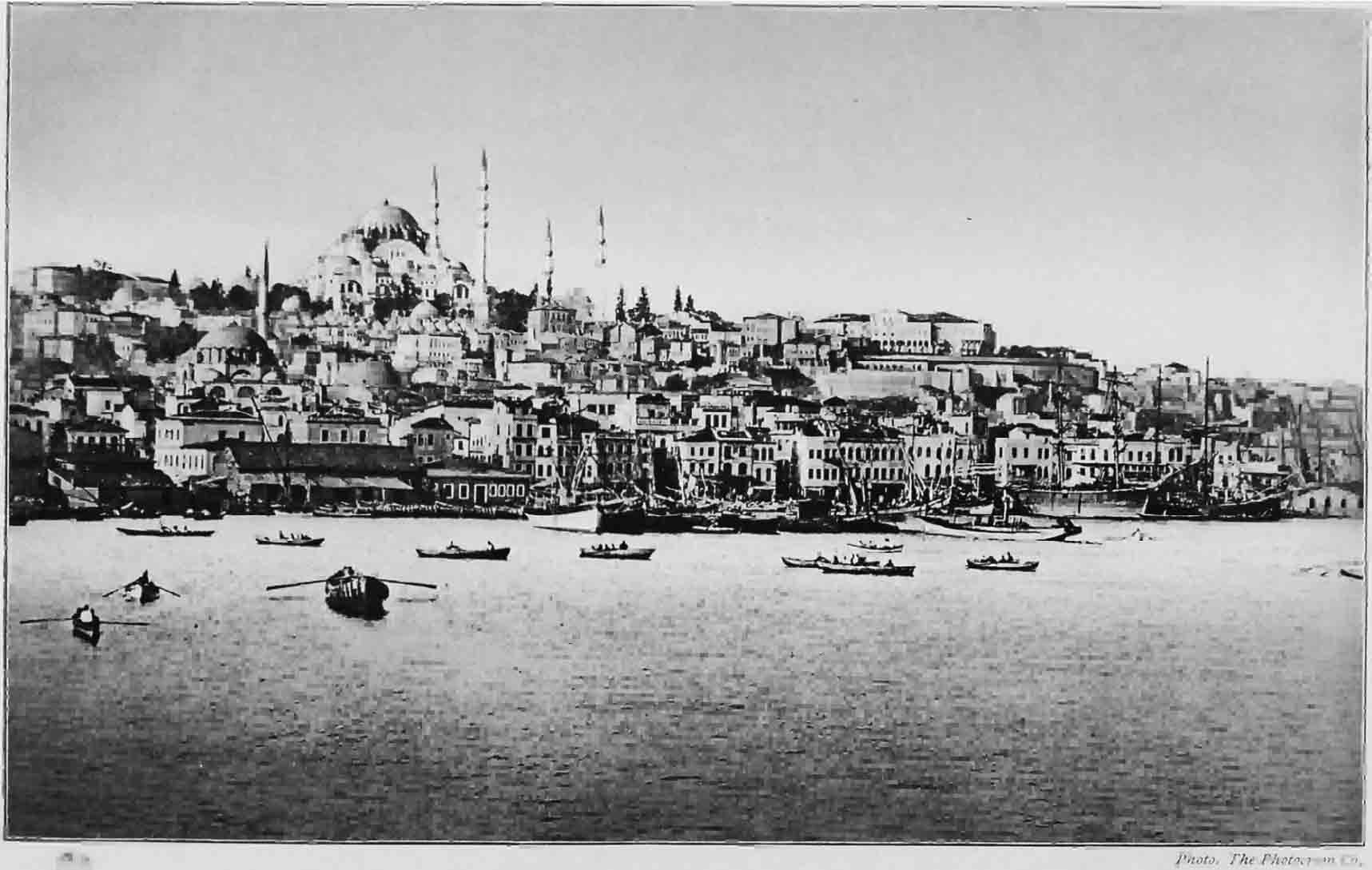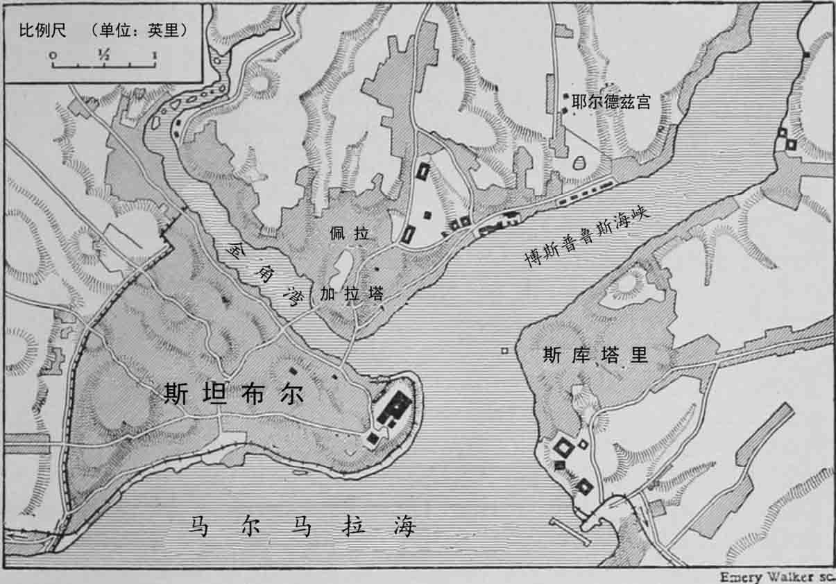 我们的视线转向东北,这里有一条宽度变化很小的海峡,表面是如蓝宝石一样蔚蓝的海水,郁郁葱葱的树林间挤满了村落和白色别墅,如同给海岸戴上了一顶花冠。这个海峡就是博斯普鲁斯海峡,经此海峡可到达黑海。正东方,在博斯普鲁斯海峡的另一侧,从海岸到矮丘的顶部的区域,是斯库塔里,它是君士坦丁堡三个主要分区的第三个。当你站在亚洲俯瞰这个交错着宽阔水道的伟大城市时,几乎会忘了斯库塔里位于亚洲。