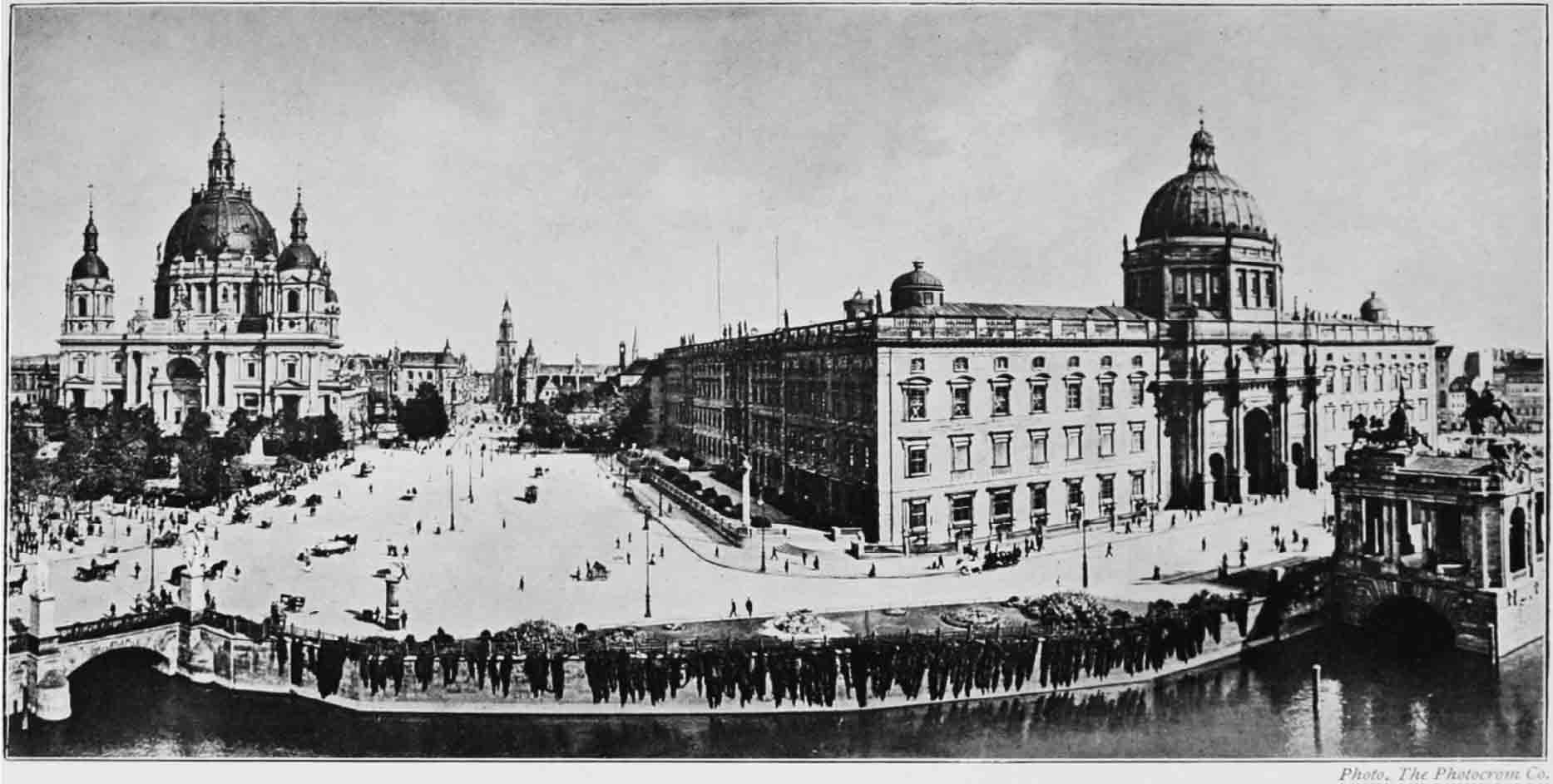 此刻是正午时分。花俏的马车和汽车呼啸而过,人行道上挤满了人。我们听着军乐队演奏着激昂的音乐,帝国卫队行进在街上,尾随着众多好奇的游客。伴着音乐,我们跟着卫队经过皇家图书馆,弗里德里克大帝从他高大的战马上俯视他如今的子民。图书馆一侧是歌剧院,而在另一侧则是有着一万名学生的大学,更远一些的是历史博物馆,那里面存放着大量的具有历史意义的战争机器。我们穿过宫殿桥,这座拱桥横跨施普雷河,然后跟着游行的队伍进入勒斯特加滕公园,军乐队停在了腓特烈·威廉三世