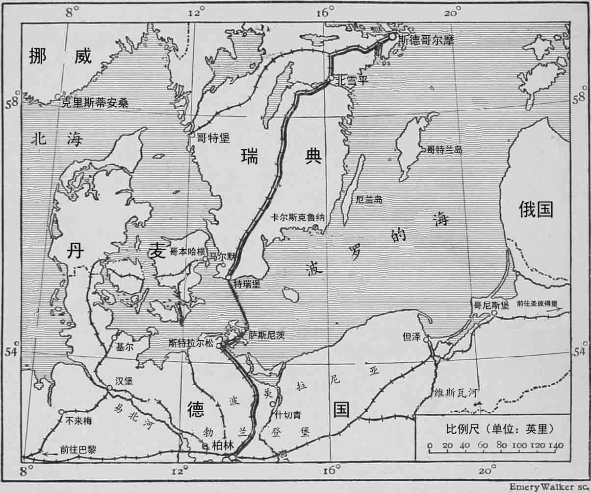 行至此处,我们理所当然地期待旅程中将会全程坐着火车,只需等着乘务员过来打开车厢门并让我们排队下车。难道说火车将会直接穿越波罗的海吗?事实正是如此。我们所乘坐的火车——在昨夜载着我们离开斯德哥尔摩——也将平静地渡过波罗的海,在到达柏林之前我们并不需要走下列车。前往德国的部分列车会由火车头拉动,驶上一艘巨大的由沉重的夹子和铁钩固定在码头上的摆渡船。铺设在瑞典陆地上的铁道和摆渡船上的铁道紧密连接,当车厢被机车拉着驶上摆渡船时,它们会被链条和钩子牢牢固定在船上,这样即使在船开始摇晃的时候,火车依然是很稳定的。当乘客在他们的包厢里躺着打盹的时候,会清楚地听到汽笛声和钢铁装置发出的声音,并发现包厢内的灯光骤然地暗下来。但当单调的活塞在气缸内呜咽、船只不断地颠簸并随后轻柔且安静地起伏时,乘客们就知道它已经出发驶入波罗的海了。